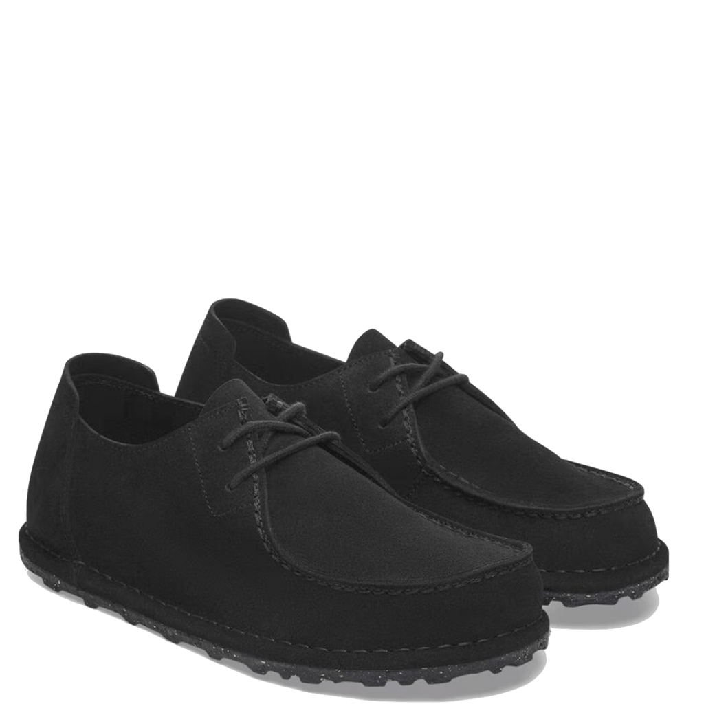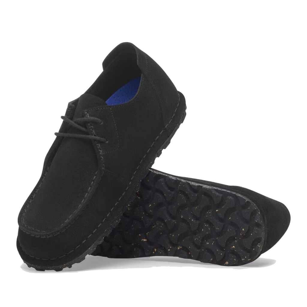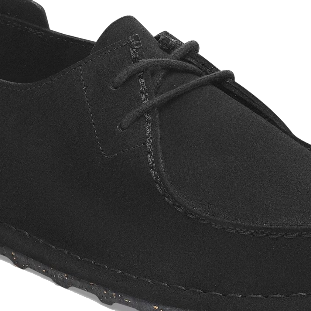 Scarpe allacciate comode, dalla forma del mocassino, con tomaia in pelle scamosciata nera. Plantare Deep Blue Birkenstock; anatomico ed estraibile. Suola in gomma caucciù naturale, con dettagli in sughero. Linguetta morbida sul tallone, che permette di infilare e sfilare comodamente la scarpa