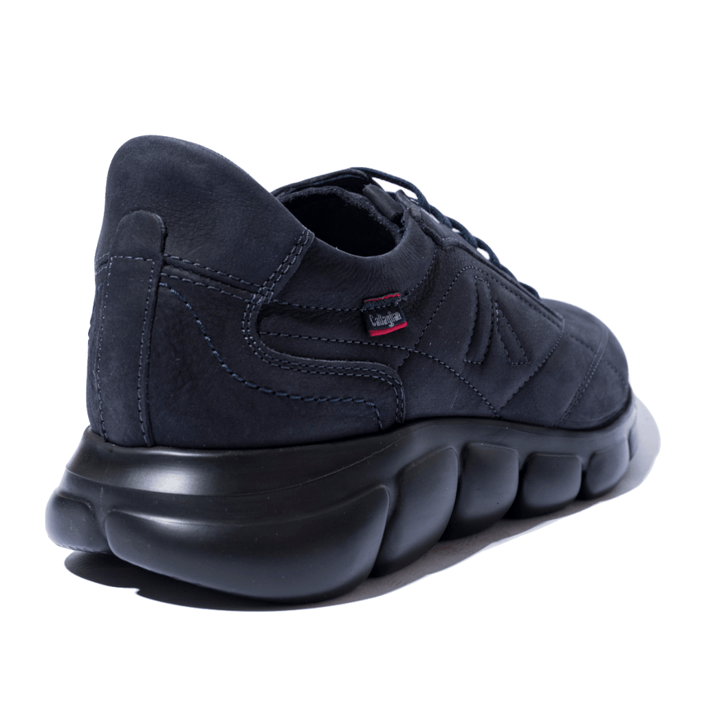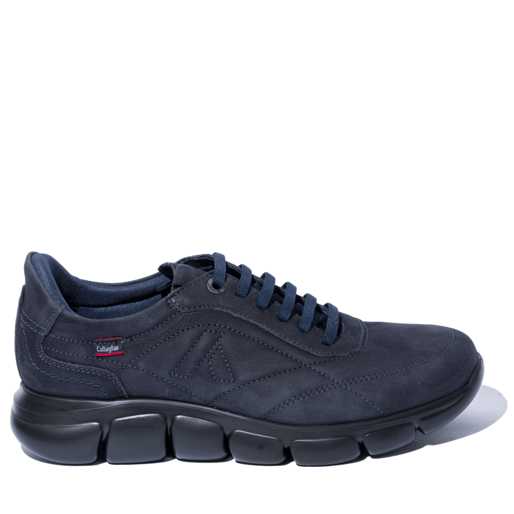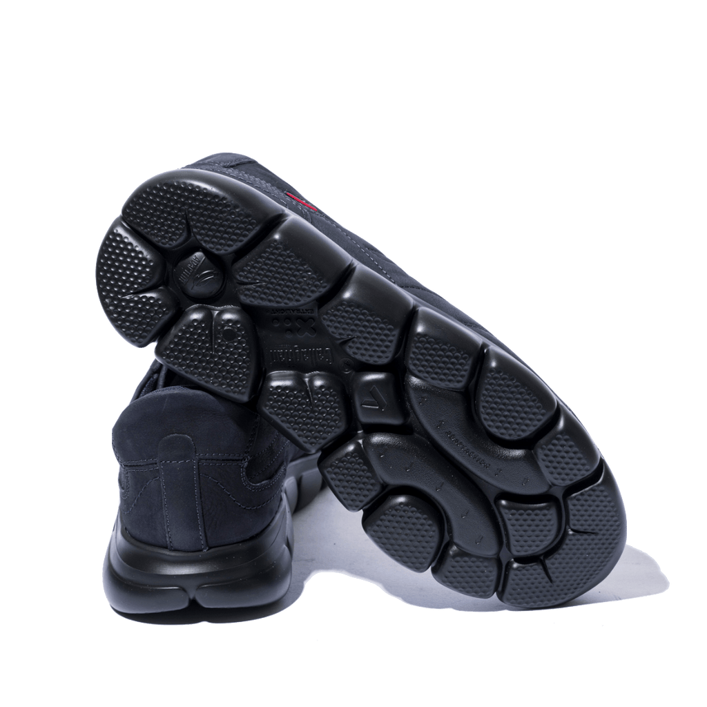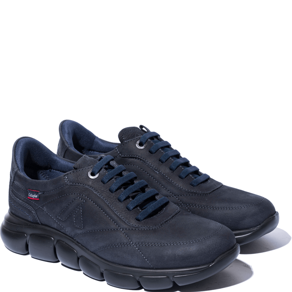 Scarpe allacciate, comode e leggere, che si adattano al piede e al suo aumento di larghezza quando si cammina (dai 5 mm agli 8 mm). Tomaia in pelle nabuck blu; interno foderato in tessuto traspirante, antibatterico e antiodore. Lacci elasticizzati; tecnologia easy fit che permette al piede di entrare ed uscire con facilità. Plantare ammortizzato, estraibile; suola in gomma flessibile, con altezza del tacco di 4 cm
