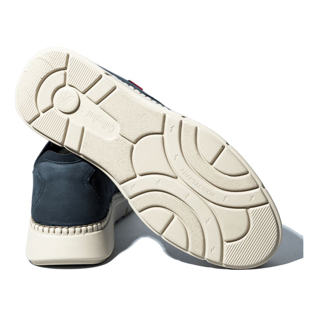 Scarpe allacciate, comode e leggere, che si adattano al piede e al suo aumento di larghezza quando si cammina (dai 5 mm agli 8 mm). Tomaia in pelle nabuck blu; interno sfoderato, con bordatura in tessuto tecnico traspirante, antibatterico e antiodore. Plantare ammortizzato, estraibile; suola in gomma flessibile, con altezza del tacco di 4 cm