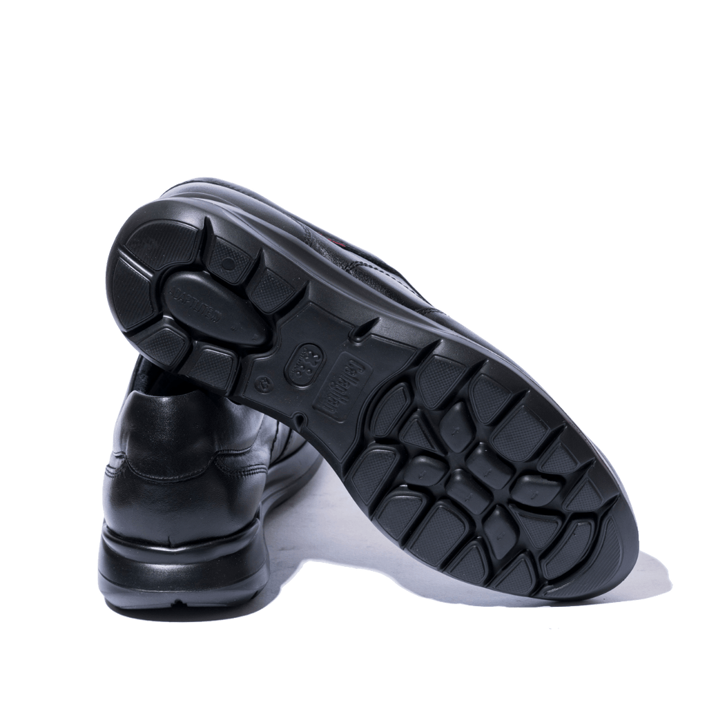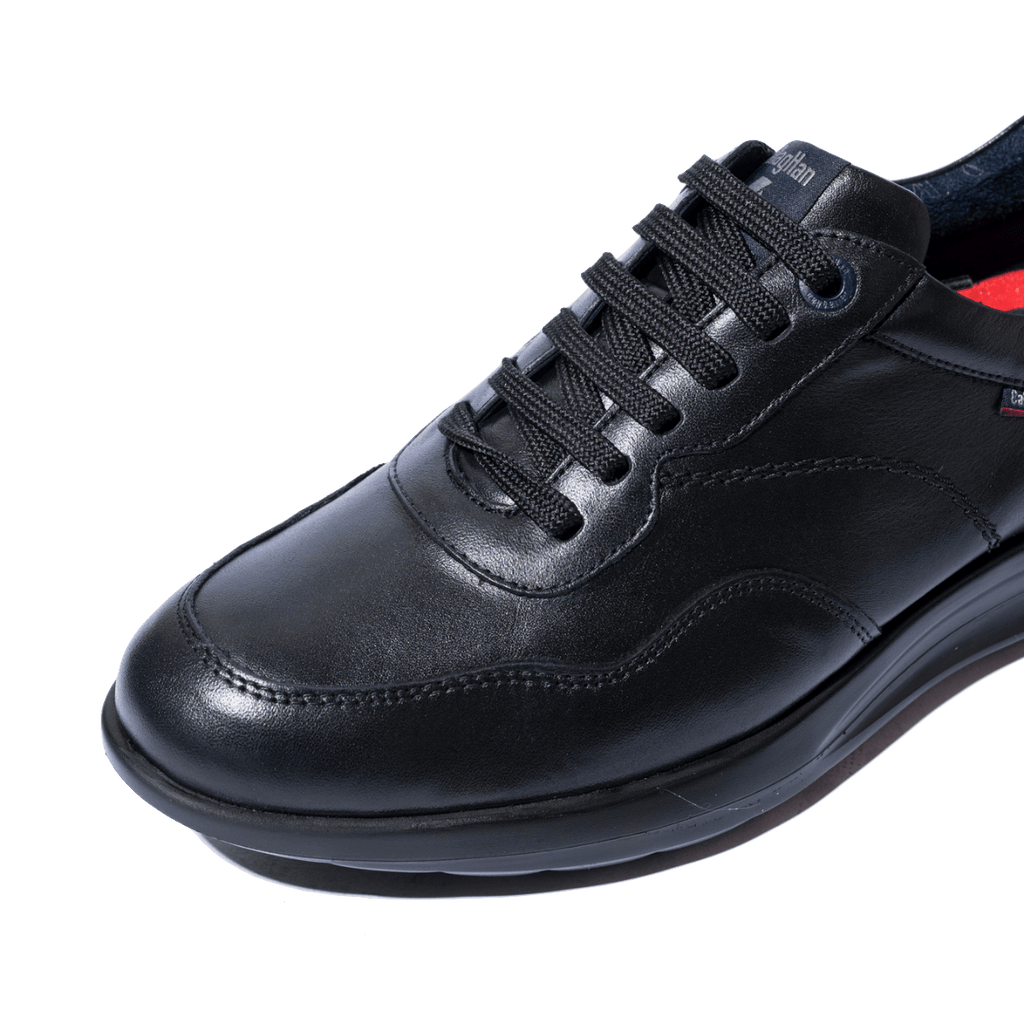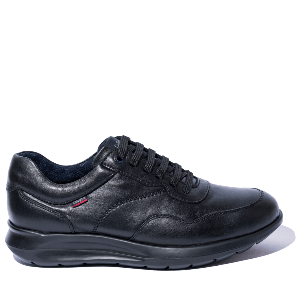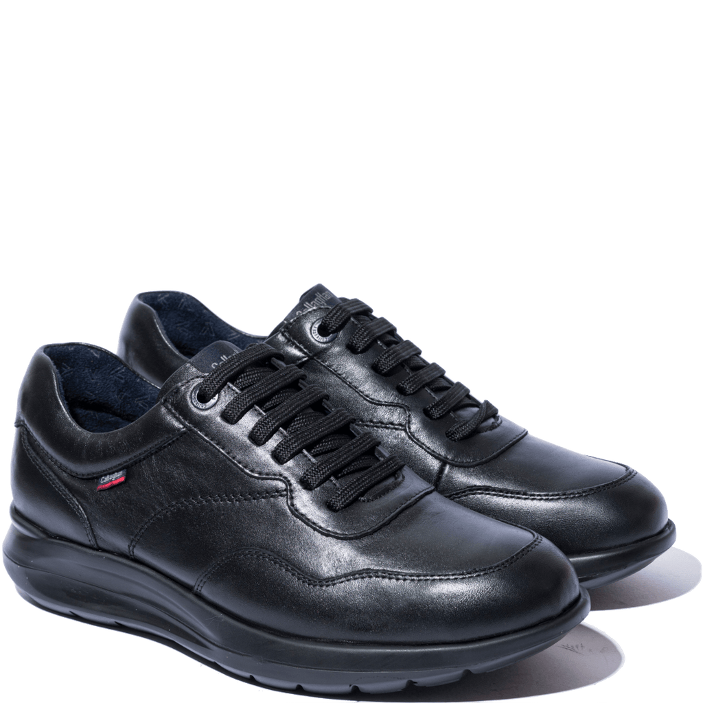 Scarpe allacciate, dalla forma leggermente affusolata, che si adattano al piede e al suo aumento di larghezza quando si cammina (dai 5 mm agli 8 mm). Tomaia in pelle nera; interno foderato in tessuto traspirante, antibatterico e anti odore. Lacci in cotone. Plantare ammortizzato, estraibile; suola in gomma flessibile