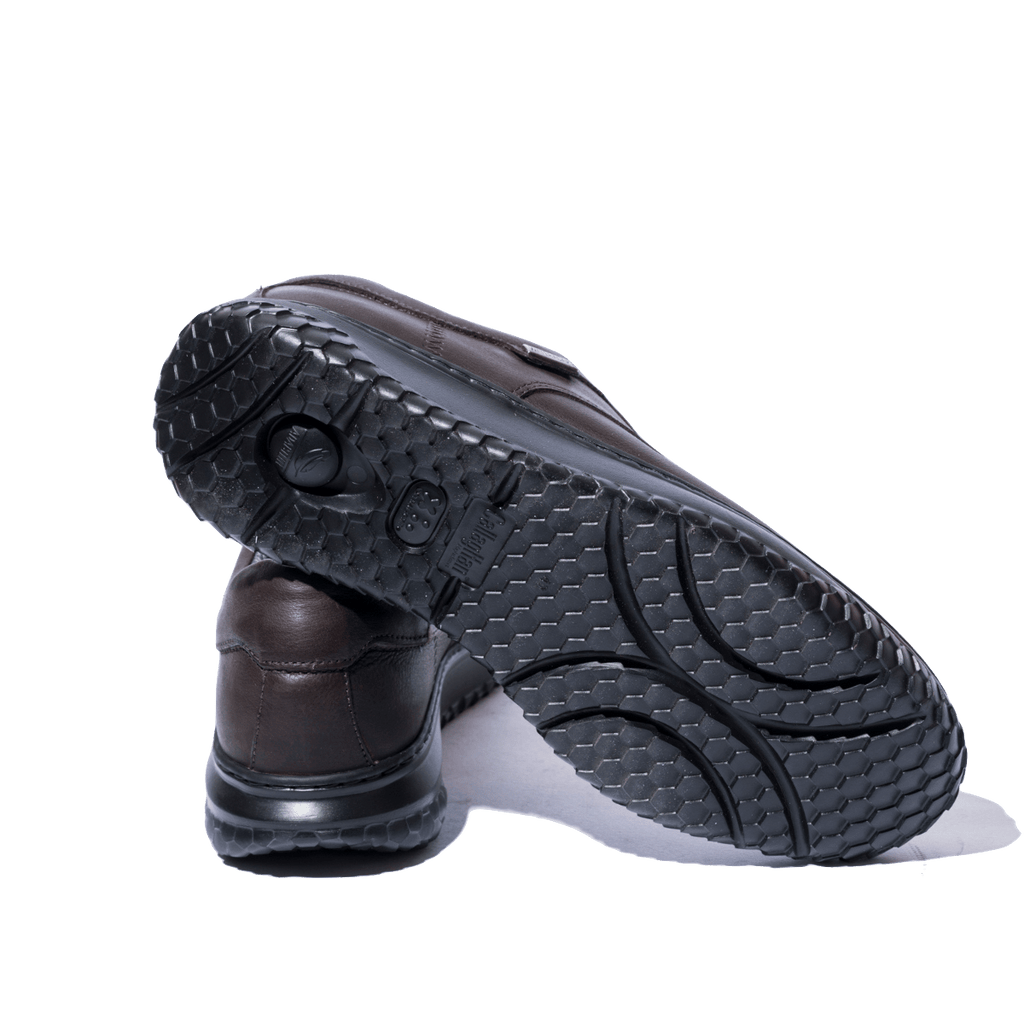 Scarpe allacciate, comode e leggere, che si adattano al piede e al suo aumento di larghezza quando si cammina (dai 5 mm agli 8 mm). Tomaia in pelle impermeabile marrone; interno foderato in tessuto traspirante, antibatterico e anti odore. Lacci in cotone. Plantare ammortizzato, estraibile; suola in gomma flessibile, con altezza del tacco di 4 cm