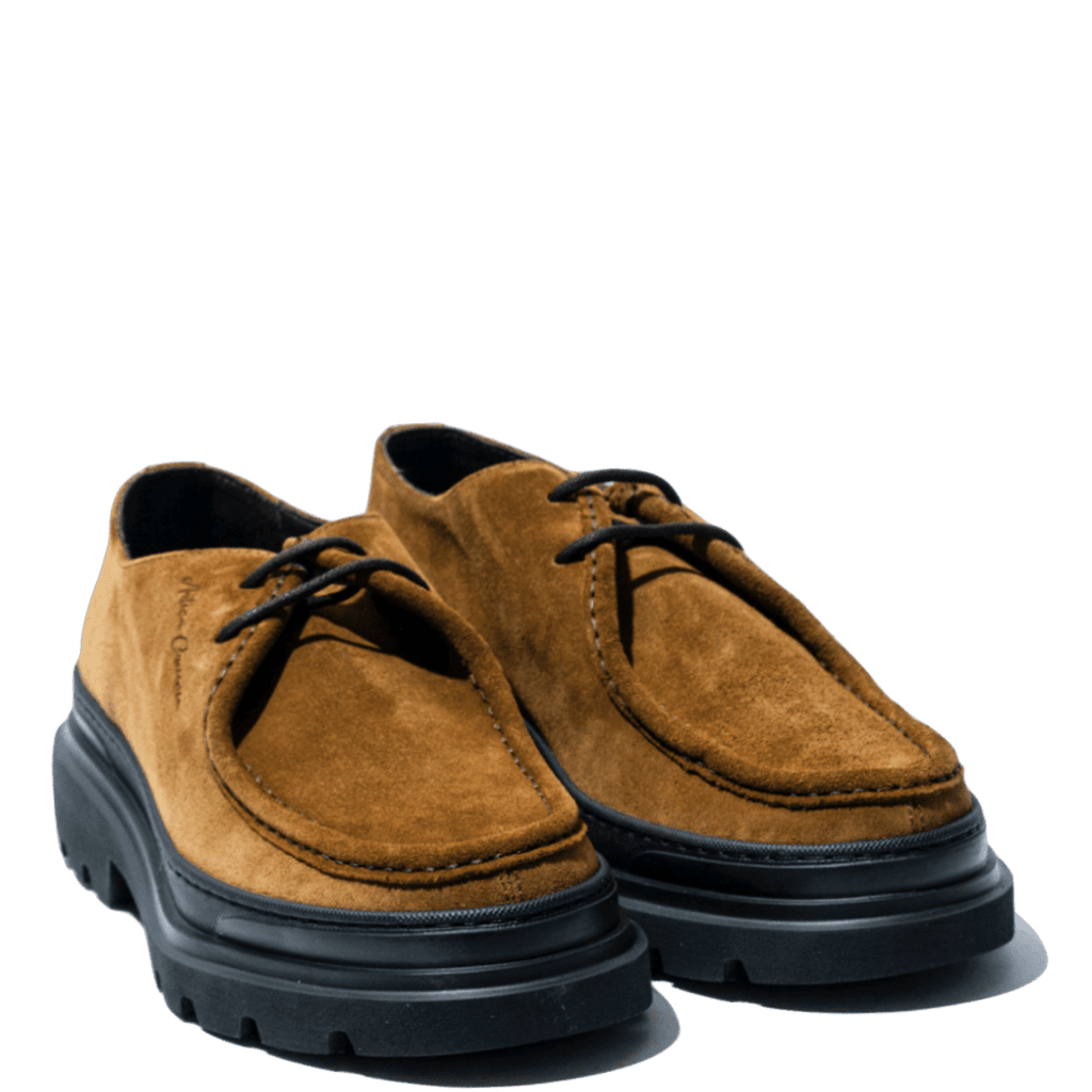 Scarpe allacciate dalla forma Moc, Made in Tuscany, in pelle scamosciata color tabacco. Interno foderato in pelle; sottopiede imbottito. Realizzate seguendo procedimenti artigianali, e impiegando pellami pregiati del distretto conciario toscano. Fondo in gomma "carro armato"