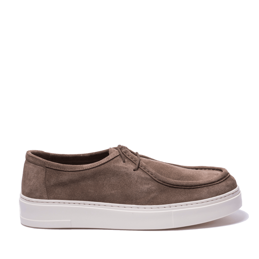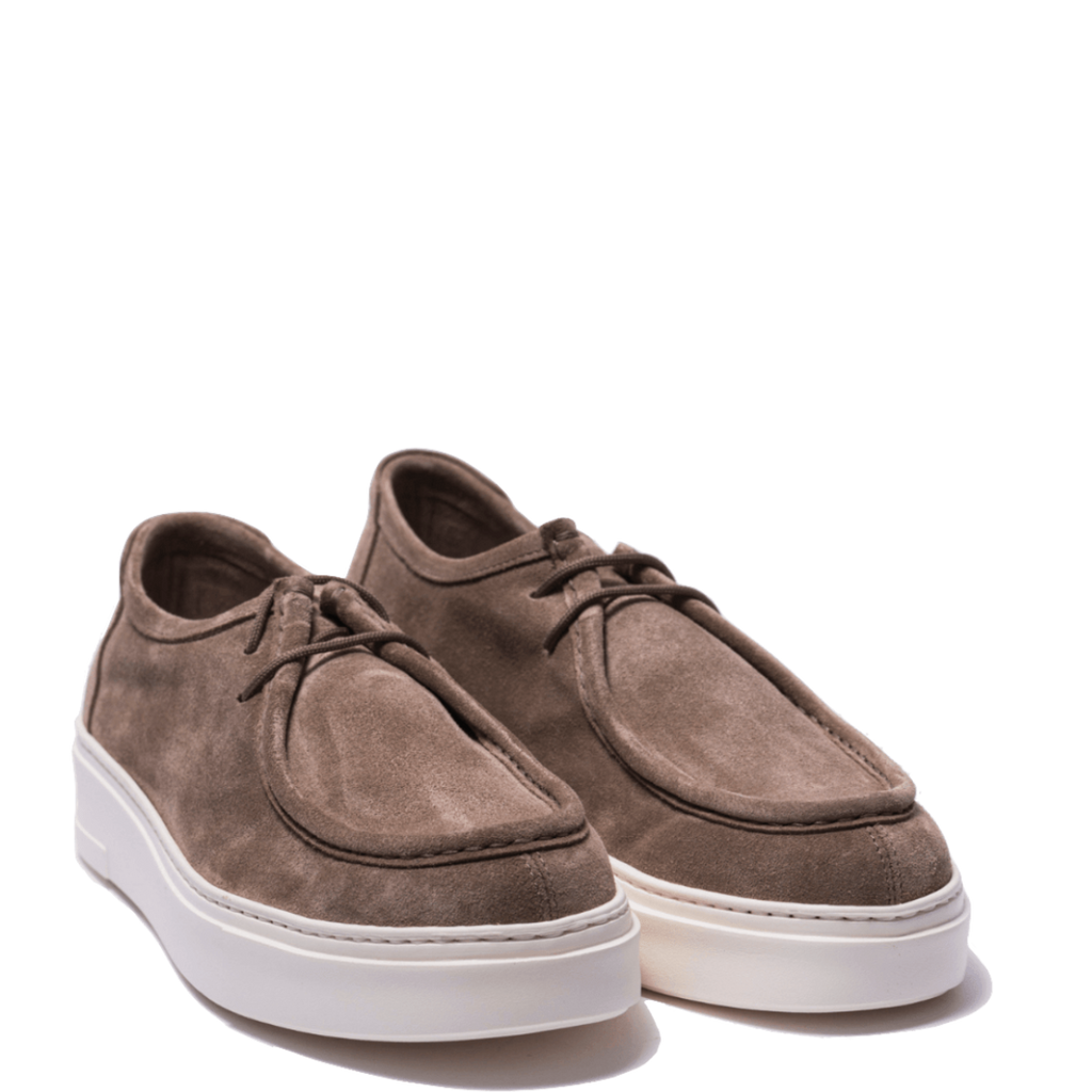 Scarpe allacciate, casual, in pelle morbida scamosciata beige. Interno sfoderato. Realizzati secondo la tradizione manifatturiera artigianale, radicata nel territorio campano. Cuciture realizzate a mano. Fondo in gomma bianca