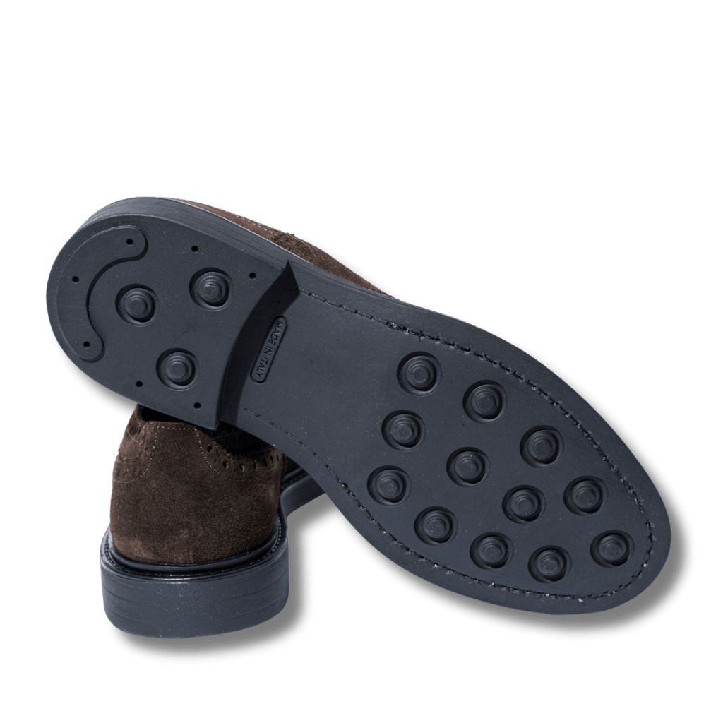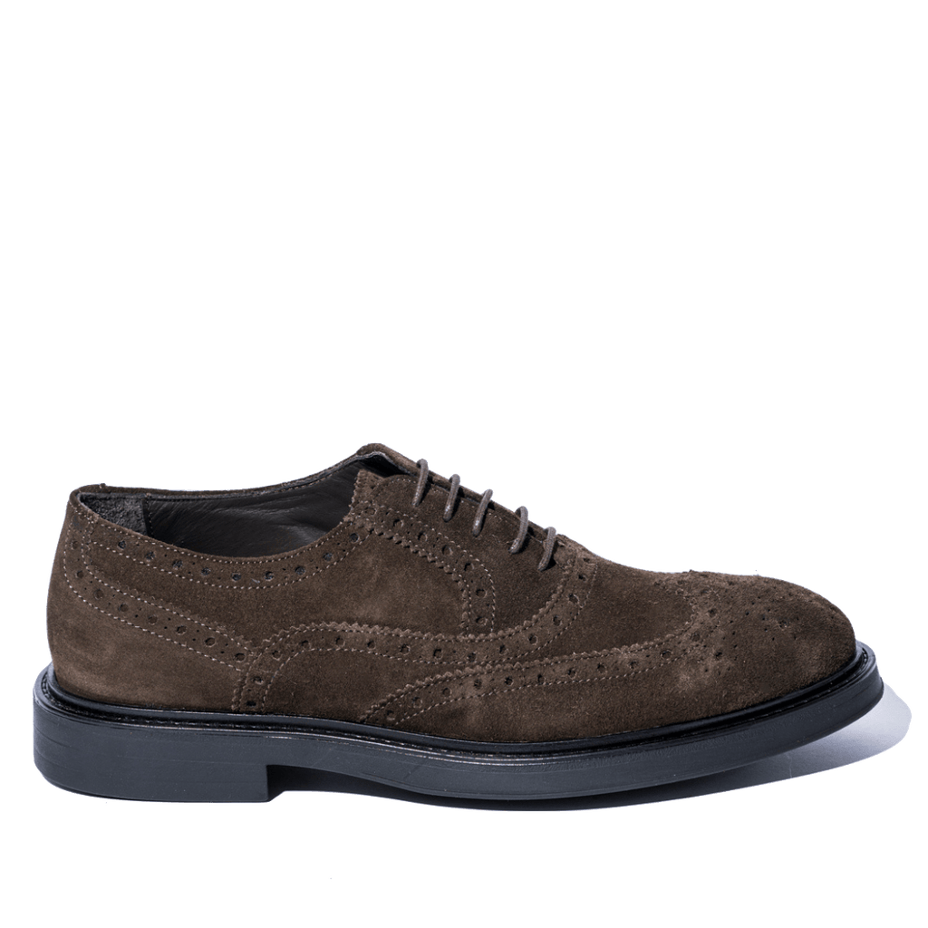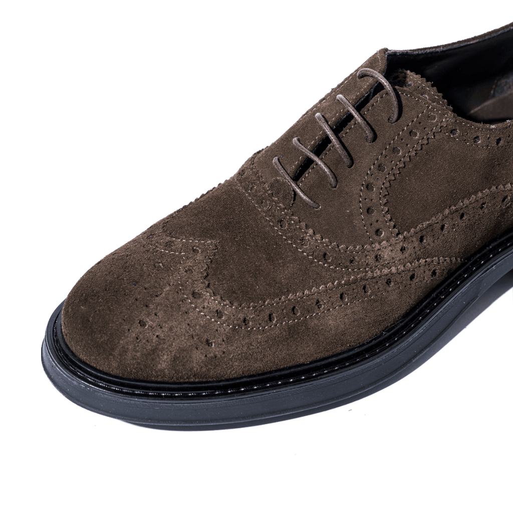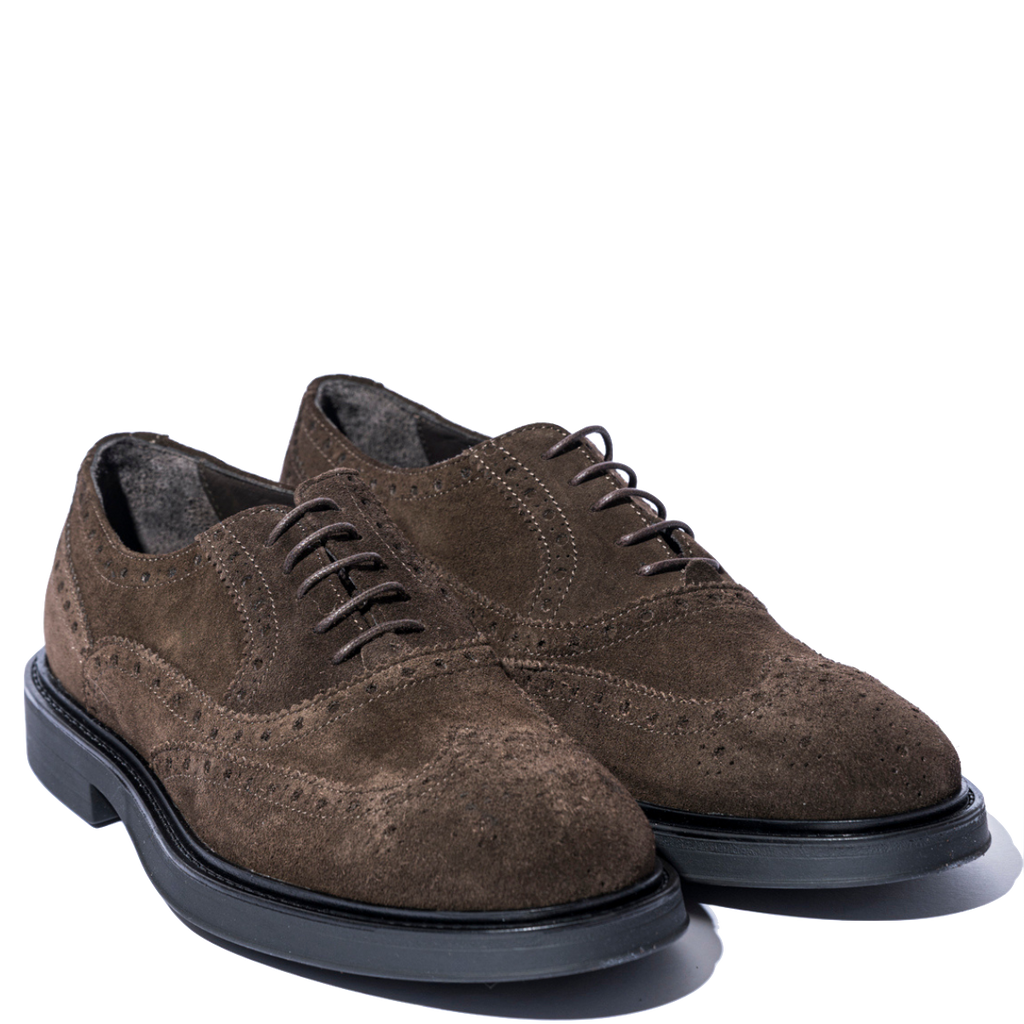 Scarpe classiche allacciate dallo stile british, inconfondibile del brand. Modello francesina, con tomaia in pelle scamosciata con coda di rondine, color marrone testa di moro. Fondo in gomma spesso, cucito su base in cuoio
