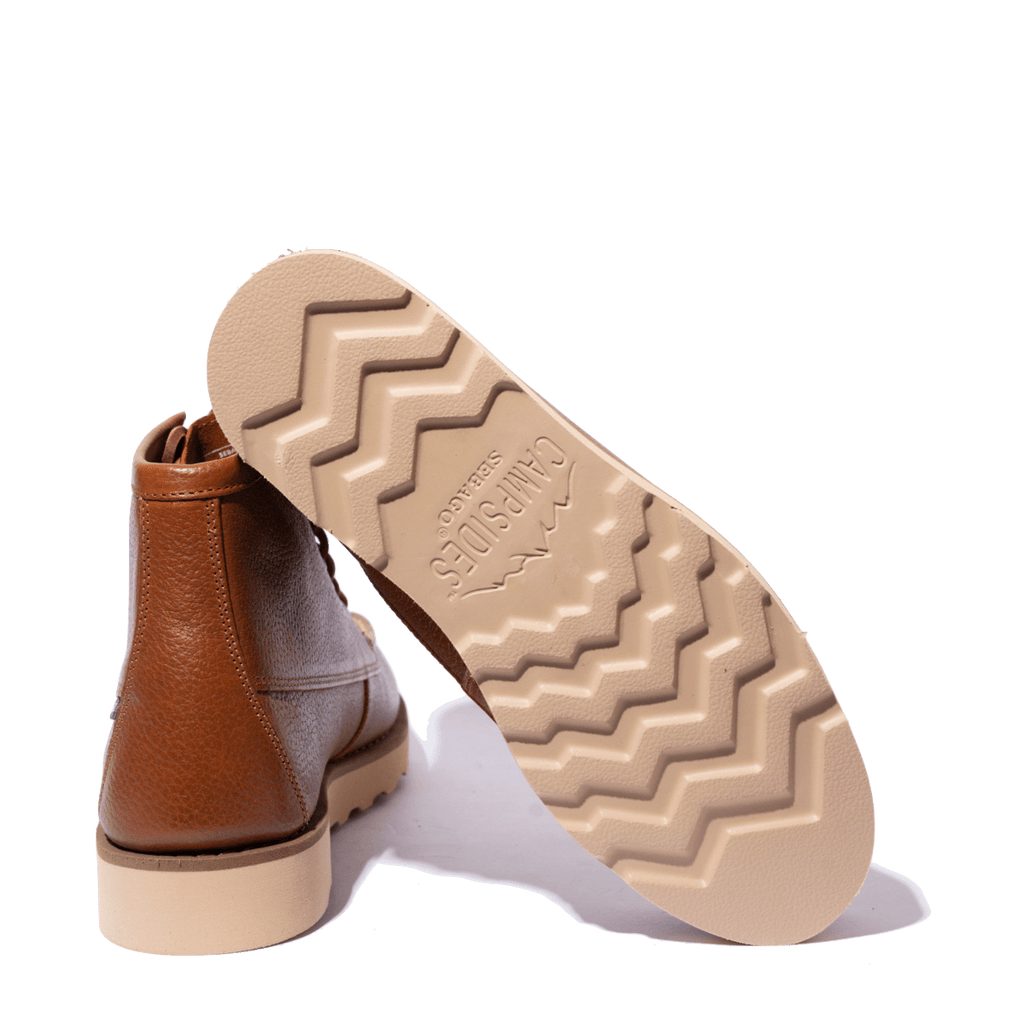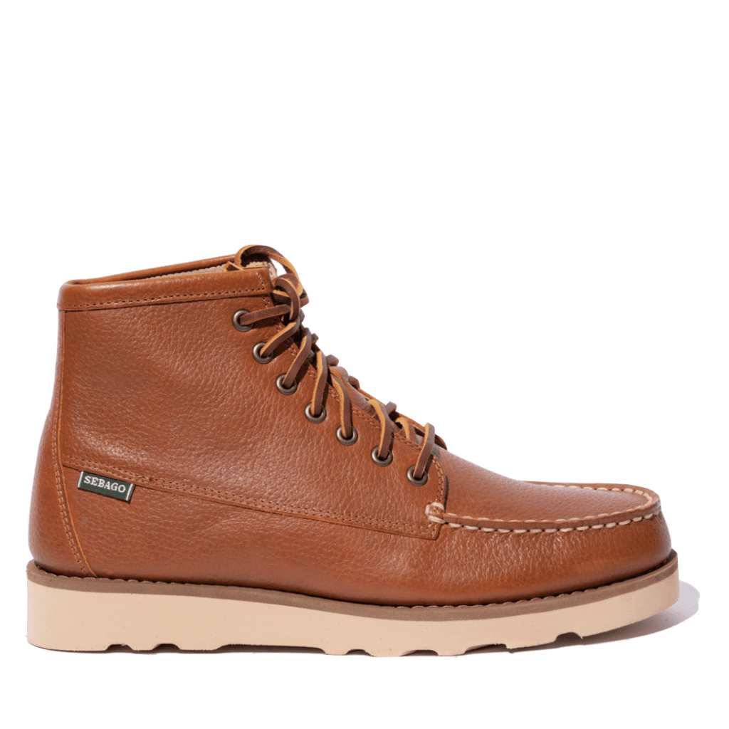 Stivaletti allacciati del marchio italiano Sebago in robusta pelle martellata marrone chiaro. Tomaia con cucitura a contrasto che richiama la forma di un mocassino. Interno foderato in pelle, lacci in cuoio; suola in leggera gomma Eva. Cuciture realizzate a mano.