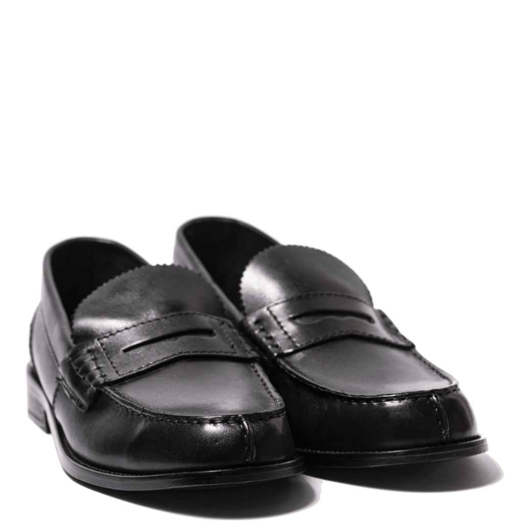 Mocassini che riprendono la forma del classico college inglese. Tomaia in pelle nera, fodera pelle; fondo in cuoio
