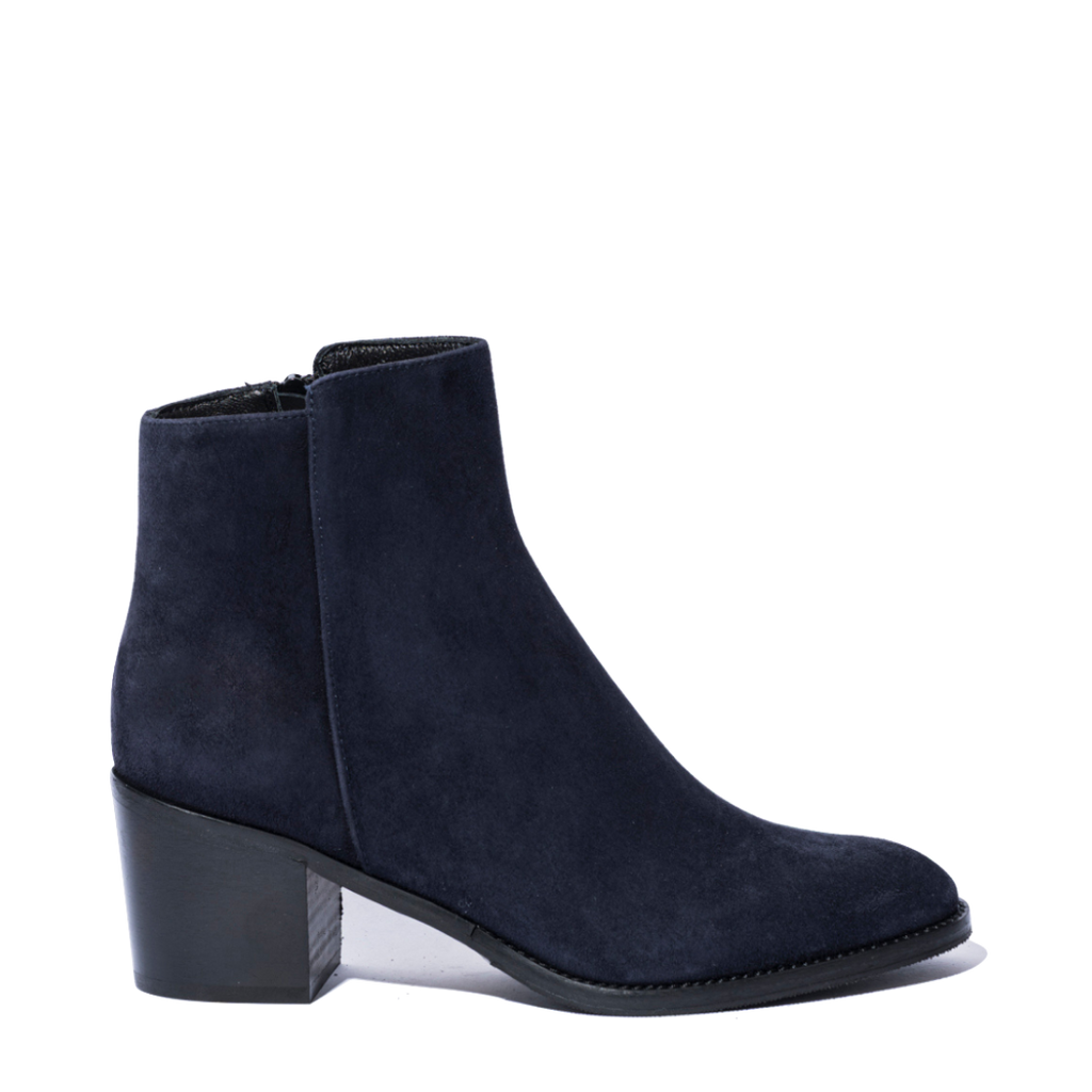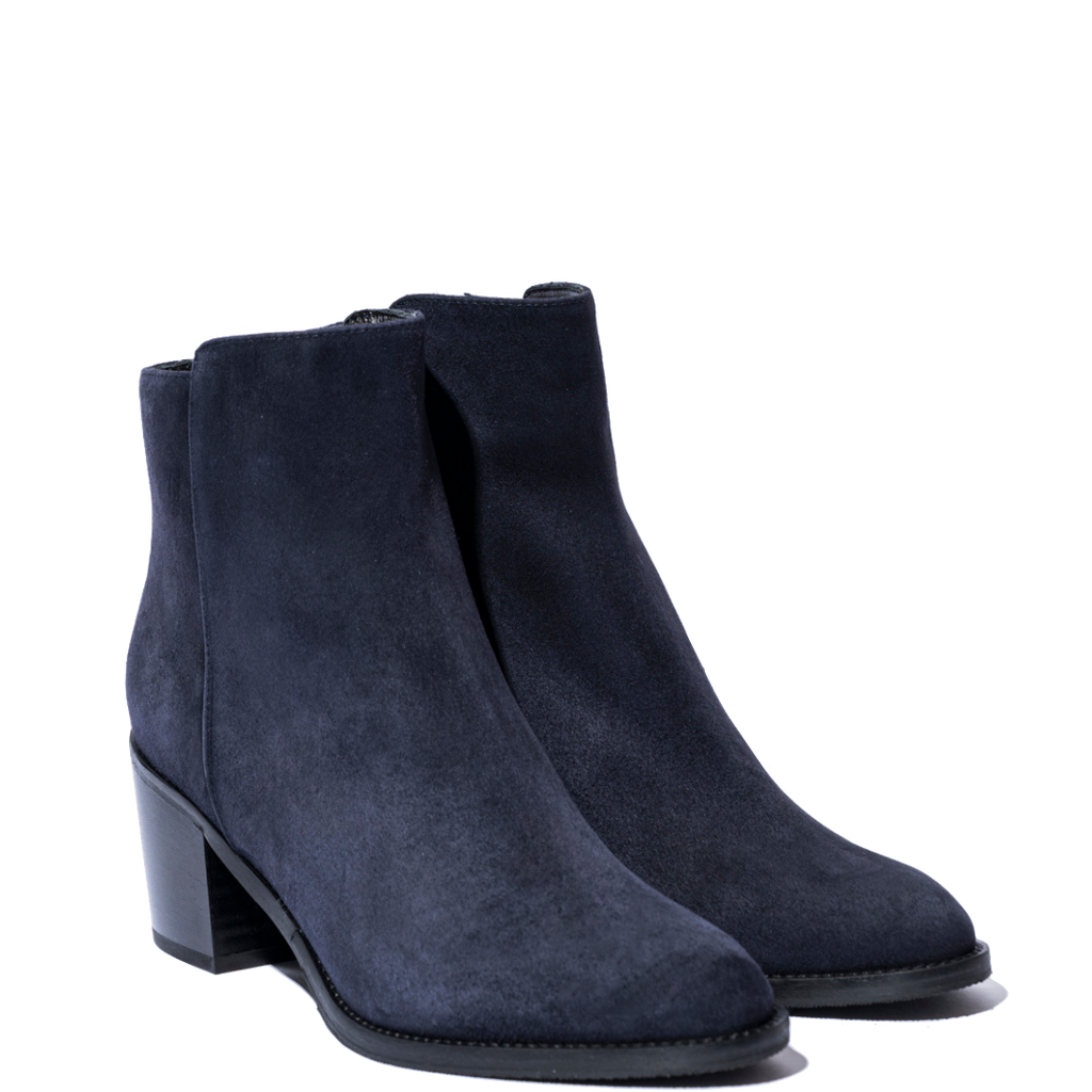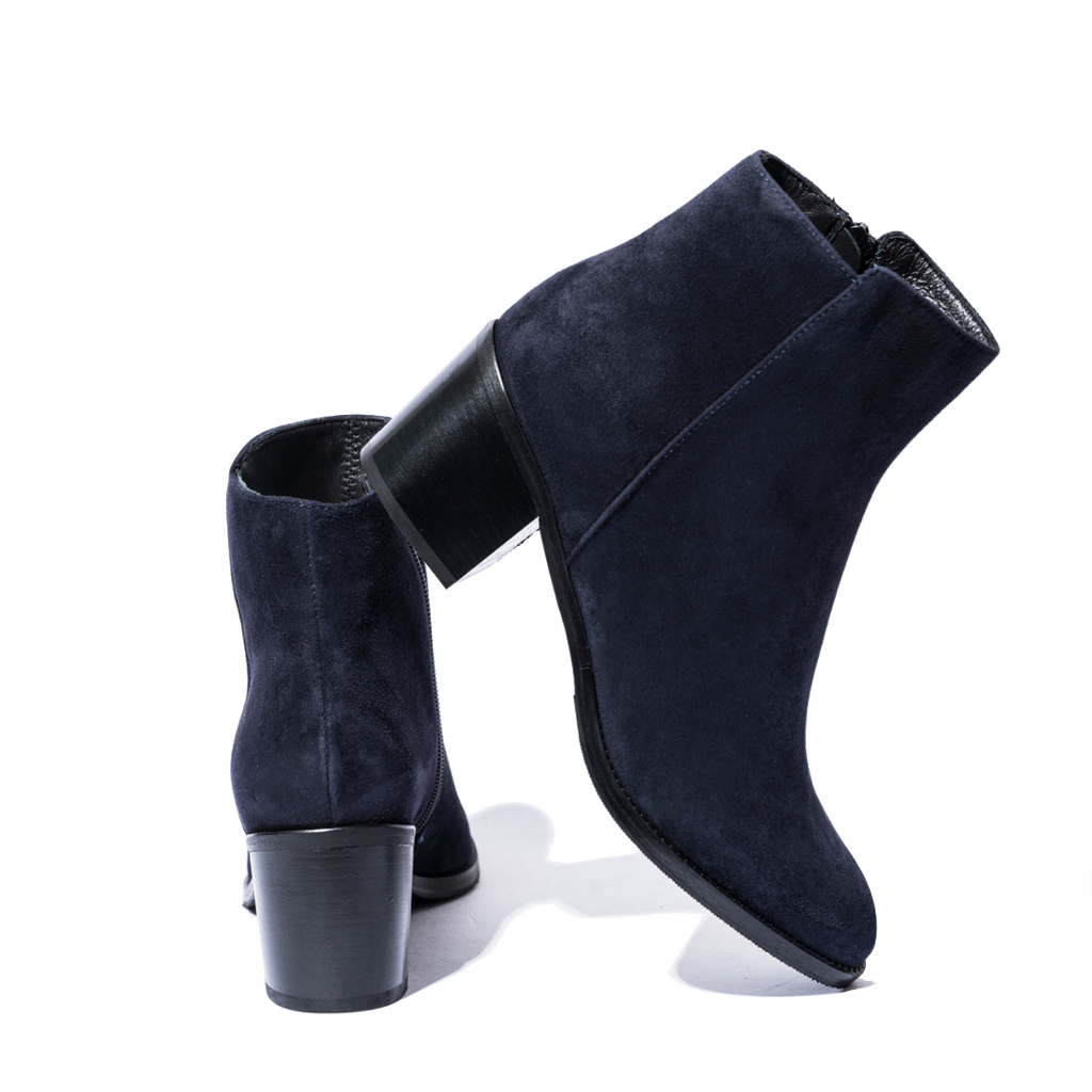 Tronchetti Luca Grossi, calzaturificio italiano che opera con i materiali più pregiati, provenienti dal distretto conciario della Toscana, che seguono la linea del camperos, mantenendo semplicità ed eleganza. Tomaia in pelle scamosciata blu. Foderati internamente in pelle. Cerniera sul lato interno della caviglia. Fondo in cuoio, con mezza gomma sottile.