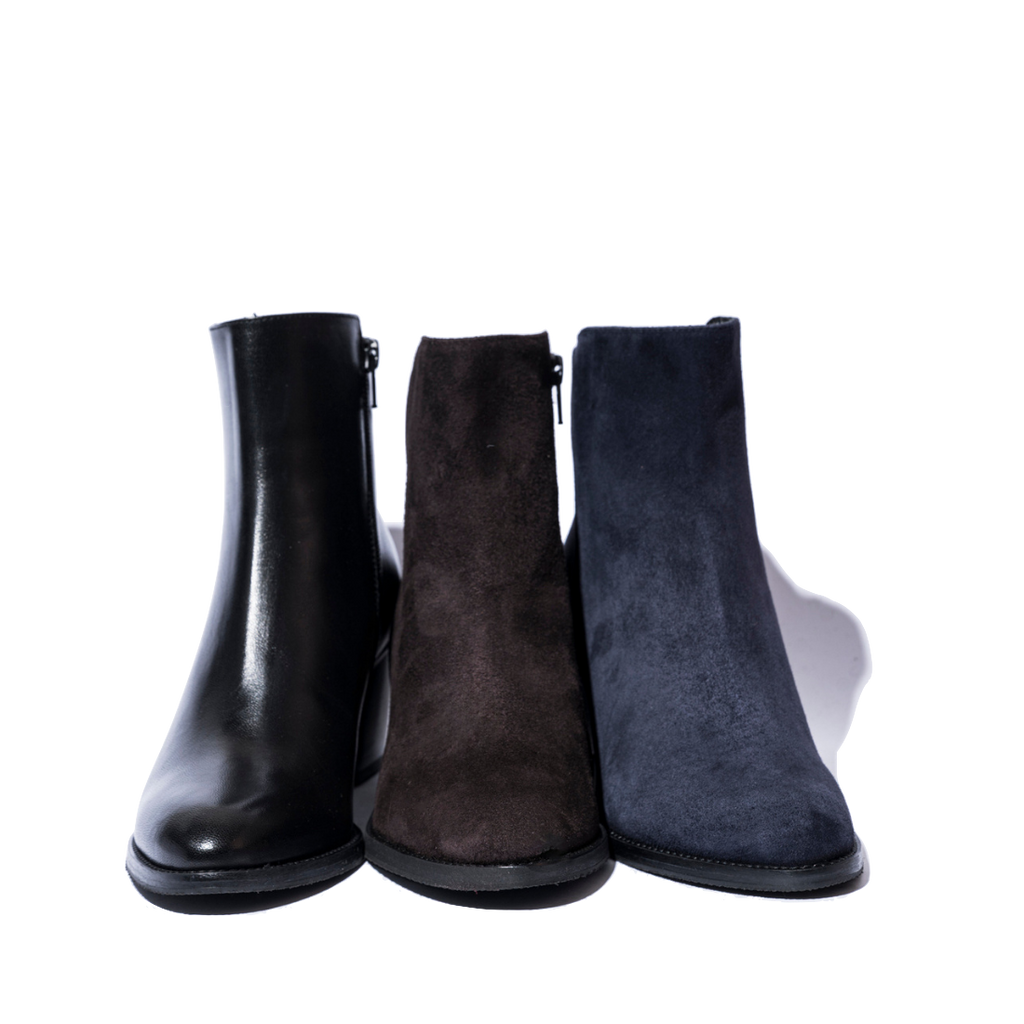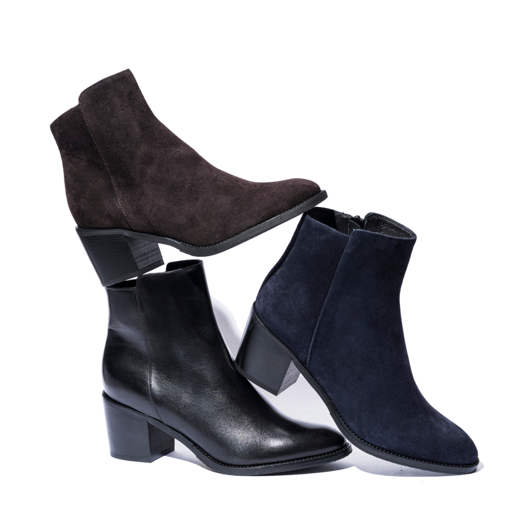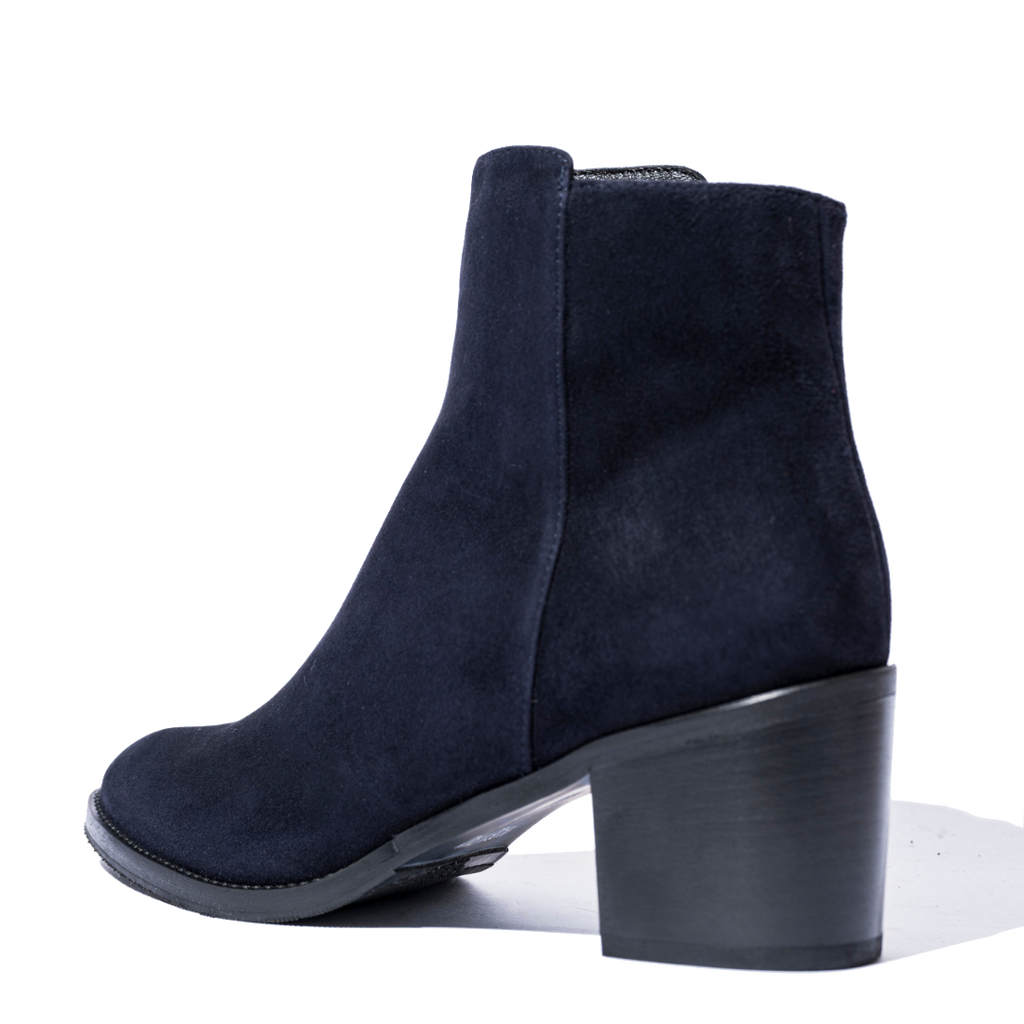 Tronchetti Luca Grossi, calzaturificio italiano che opera con i materiali più pregiati, provenienti dal distretto conciario della Toscana, che seguono la linea del camperos, mantenendo semplicità ed eleganza. Tomaia in pelle scamosciata blu. Foderati internamente in pelle. Cerniera sul lato interno della caviglia. Fondo in cuoio, con mezza gomma sottile.