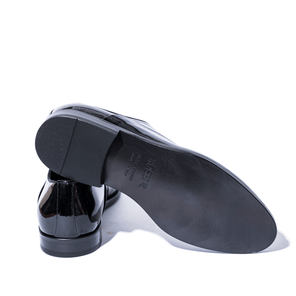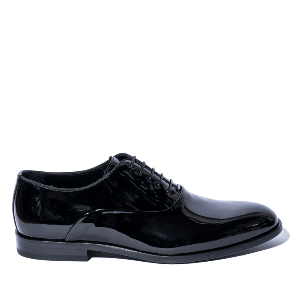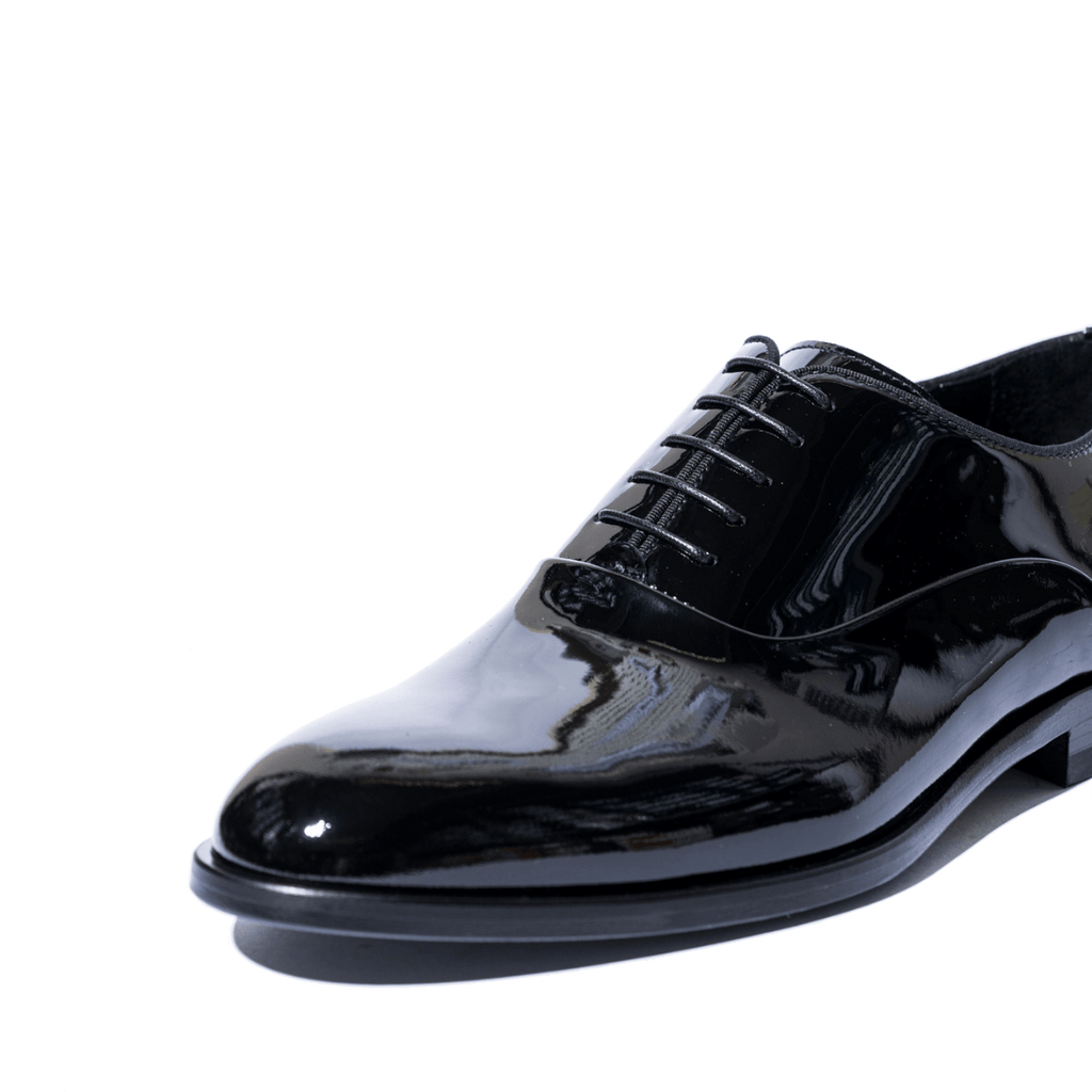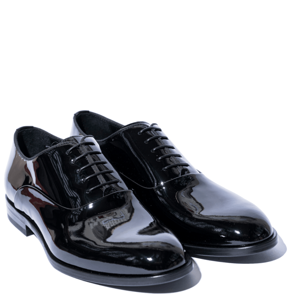 Scarpe eleganti stringate, modello francesina, adatte allo Smoking, con tomaia in pelle verniciata nera, fodera in pelle e fondo in cuoio. Lavorazione artigianale ago, che rende le calzature molto comode, robuste e durevoli.