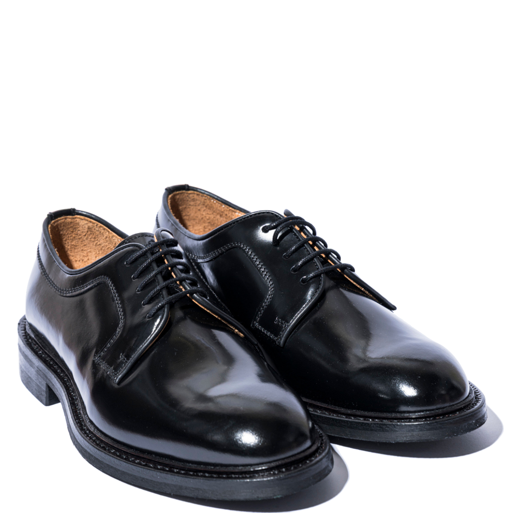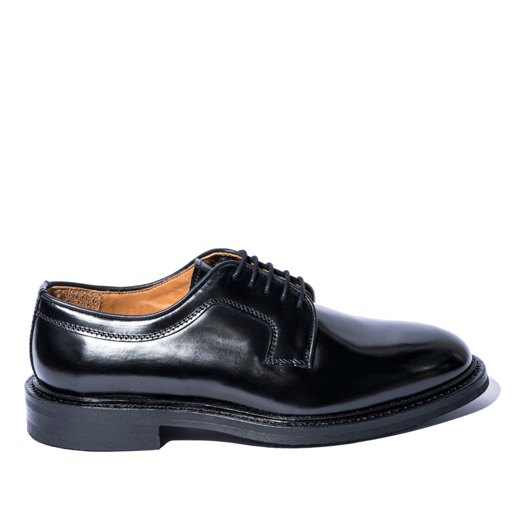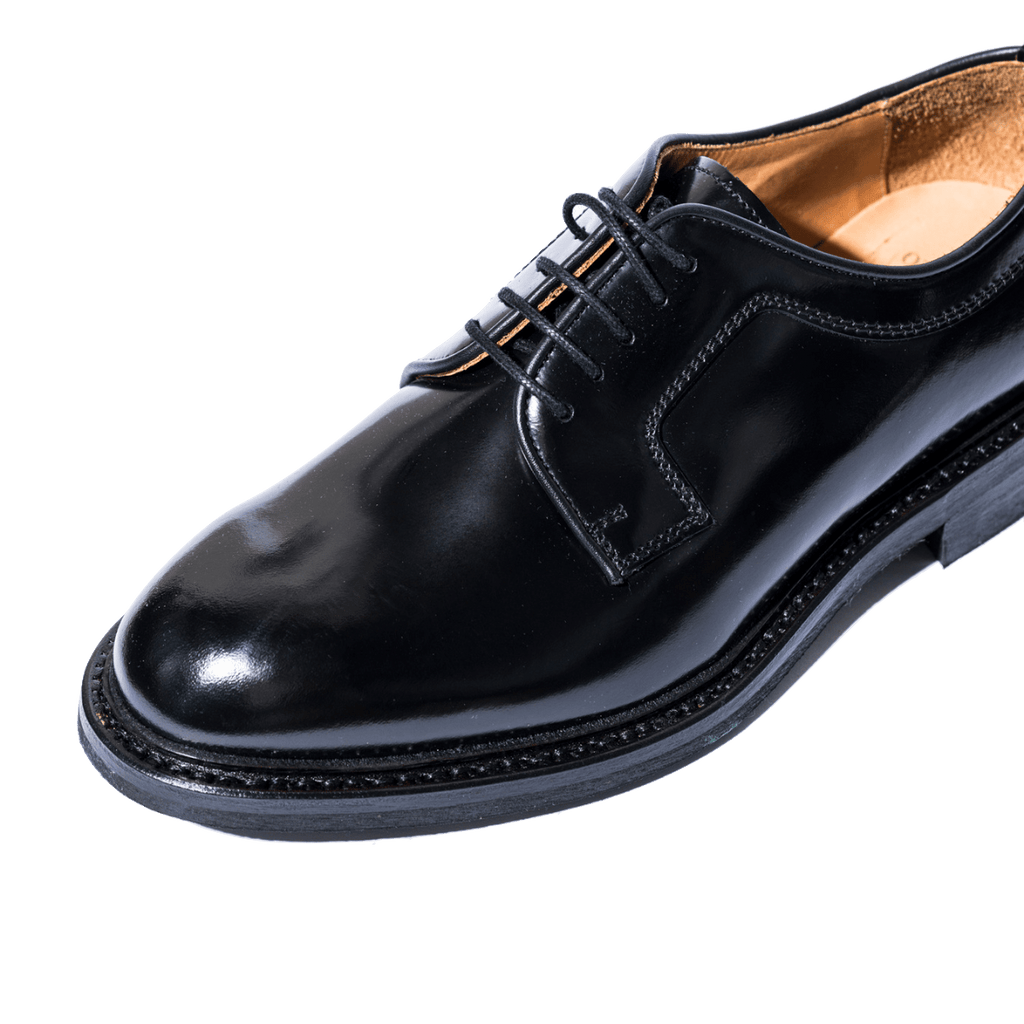 Scarpe classiche allacciate dallo stile british, inconfondibile del brand. Modello derby, senza la cucitura sul collo del piede, con tomaia in pelle abrasivata, nera. Fondo in gomma, Dainite Made in England 12 mm, cucito sul cuoio con la lavorazione Goodyear*.