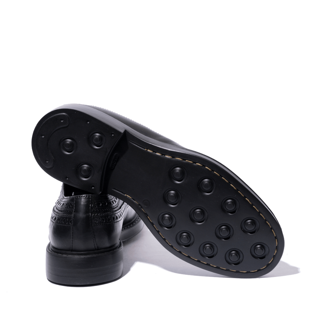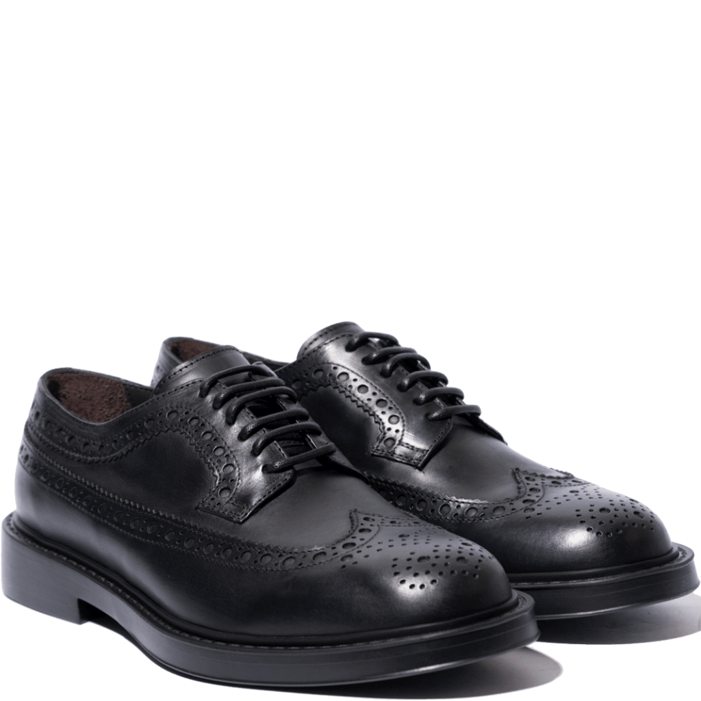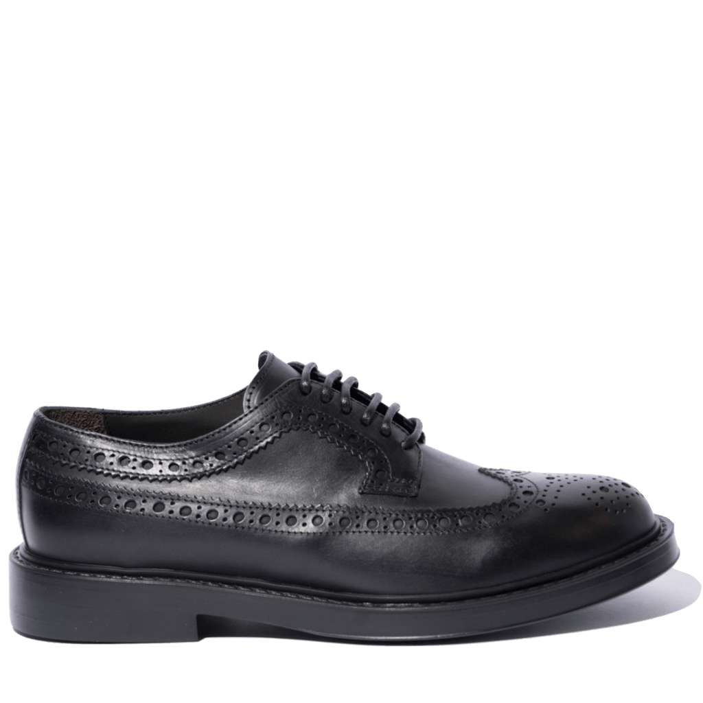 Calzature stringate, modello derby, senza la cucitura sul collo del piede, di origine marchigiana. Tomaia in pelle nera, con coda di rondine. Interno foderato in pelle; plantare in pelle. Fondo in gomma con bolli antiscivolo. Ideali per un look classico, ma dall'impiego versatile: con abbigliamento più informale e casual. Realizzati con l'impiego di pellami e materiali pregiati.