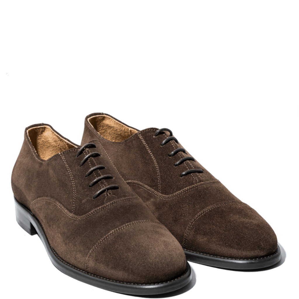 Scarpe classiche allacciate, modello francesina, in pelle scamosciata marrone, realizzate artigianalmente a Napoli, con rifiniture a mano. Fondo in cuoio