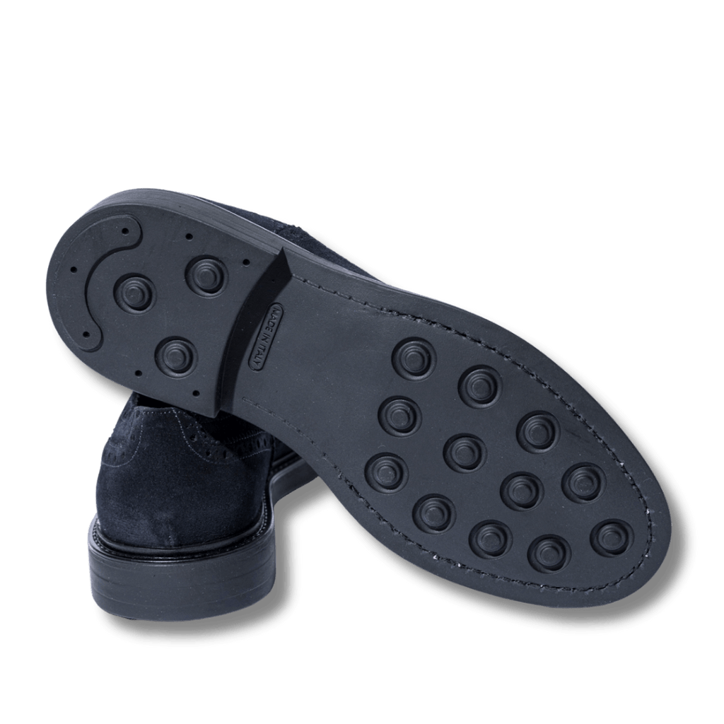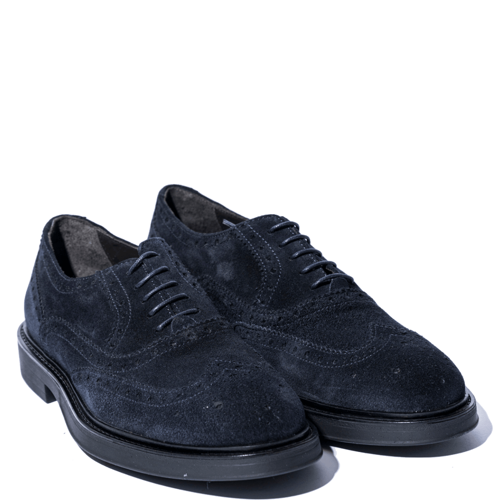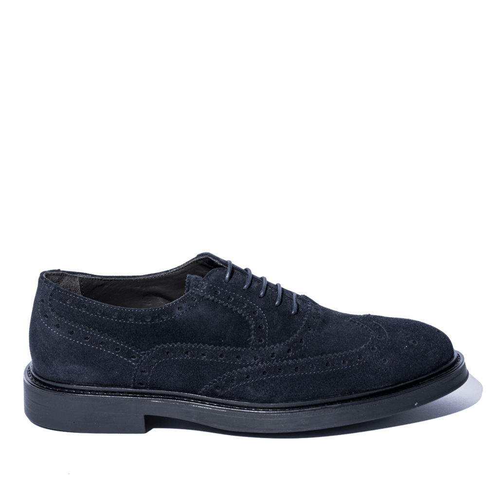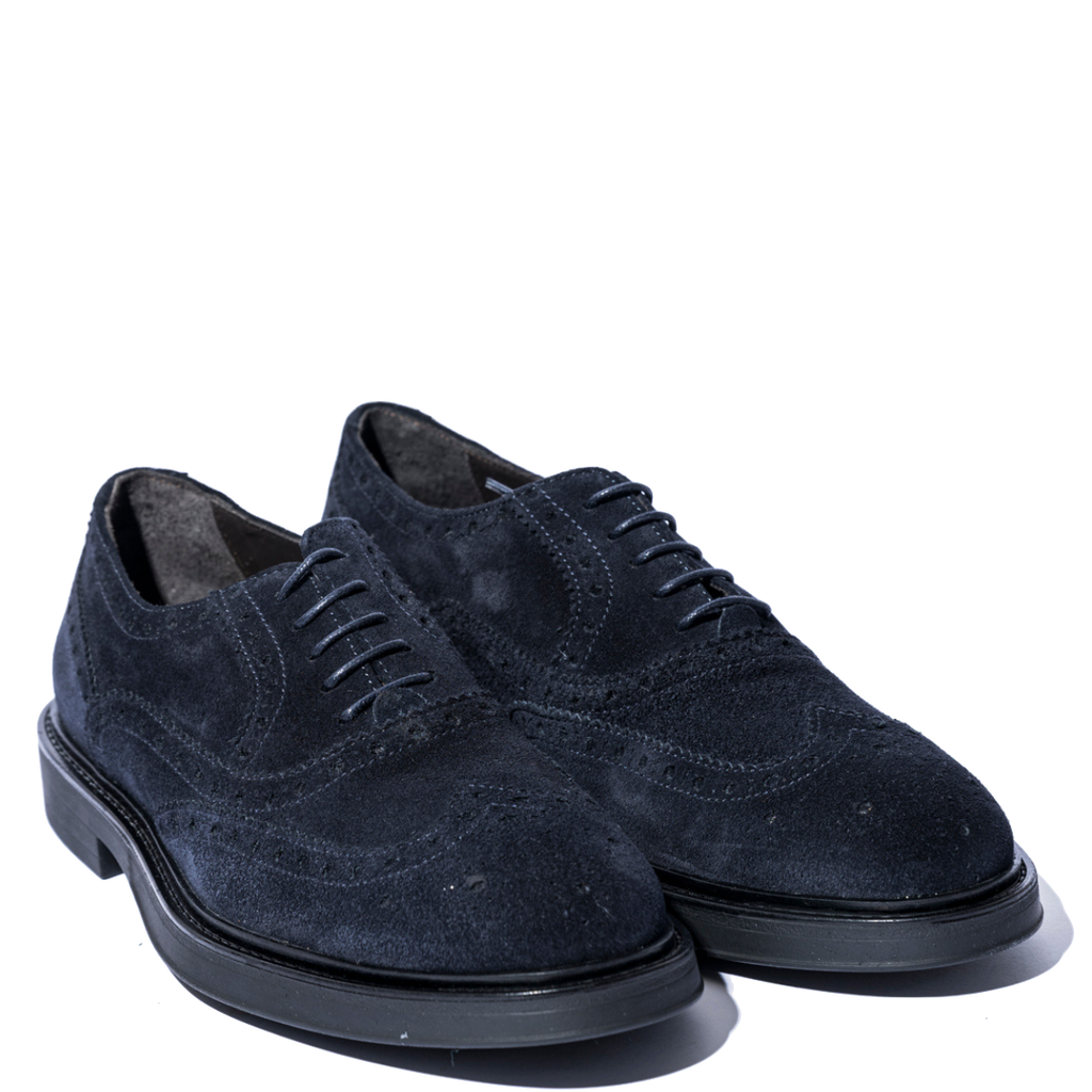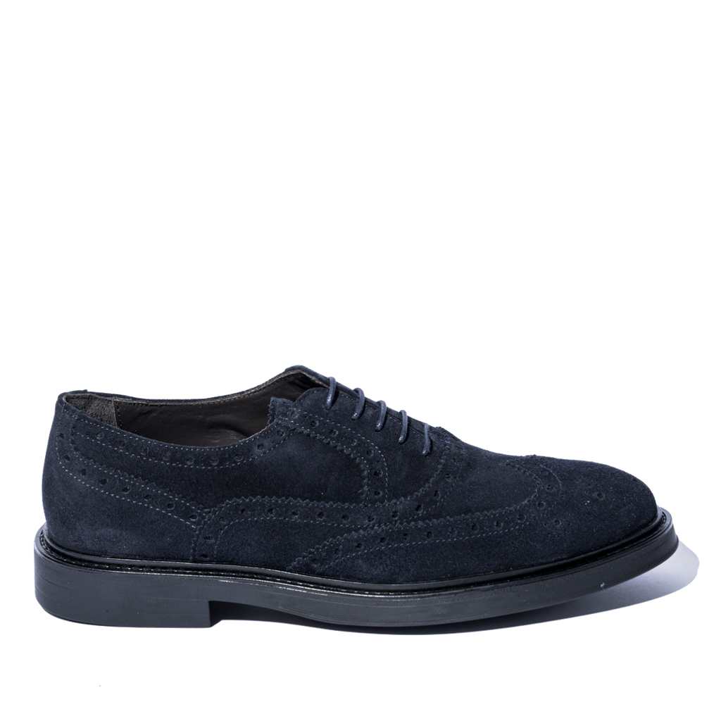 Scarpe classiche allacciate dallo stile british, inconfondibile del brand. Modello francesina, con tomaia in pelle scamosciata con coda di rondine, blu. Fondo in gomma spesso, cucito su base in cuoio