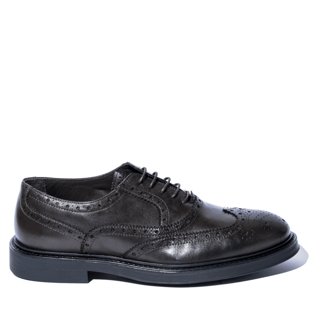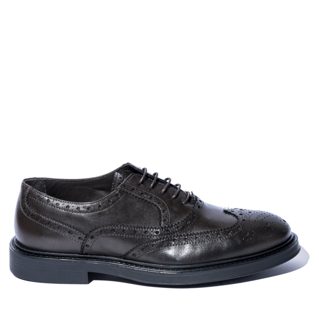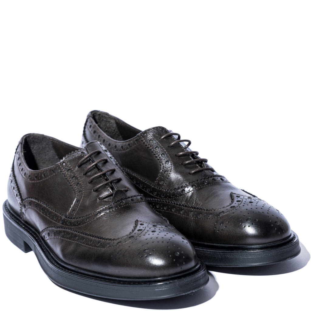 Scarpe classiche allacciate dallo stile british, inconfondibile del brand. Modello francesina, con tomaia in pelle con coda di rondine, color marrone testa di moro. Fondo in gomma spesso, cucito su base in cuoio