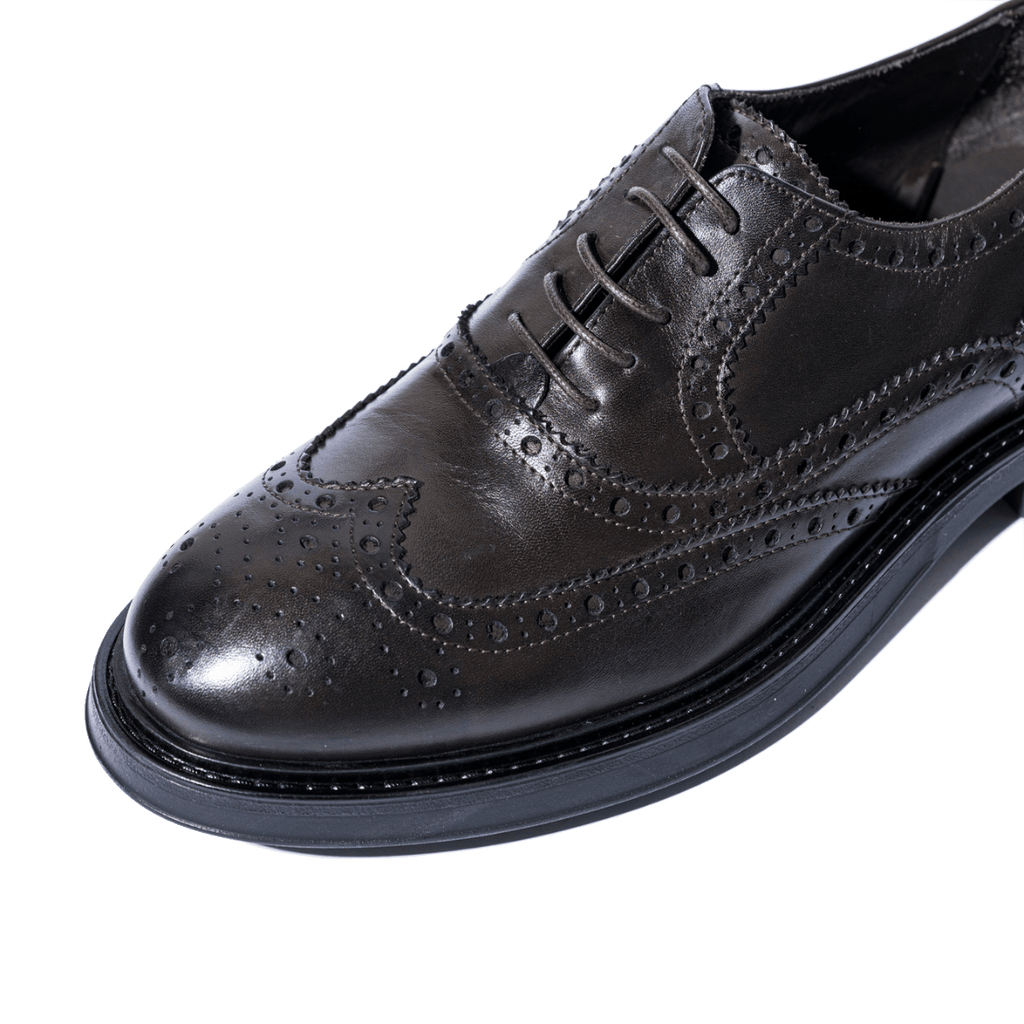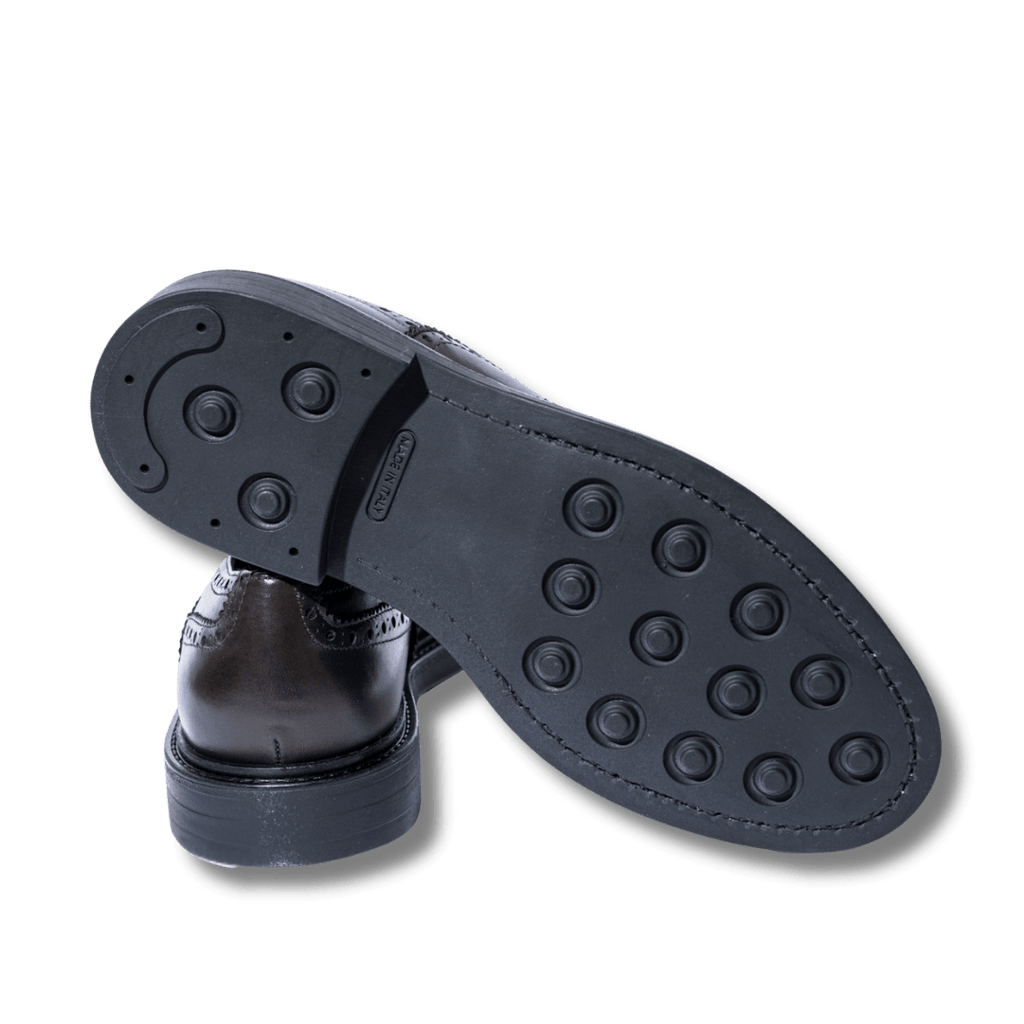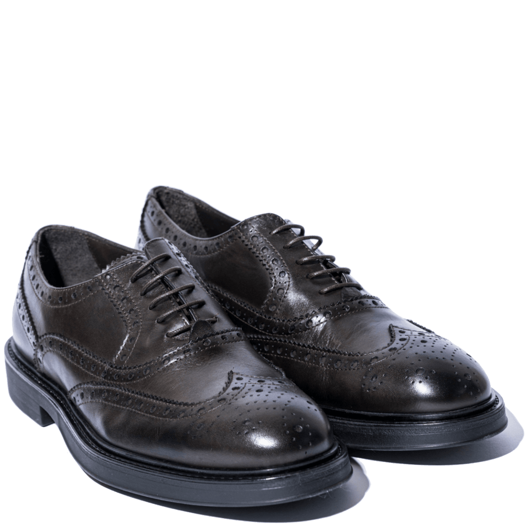 Scarpe classiche allacciate dallo stile british, inconfondibile del brand. Modello francesina, con tomaia in pelle con coda di rondine, color marrone testa di moro. Fondo in gomma spesso, cucito su base in cuoio