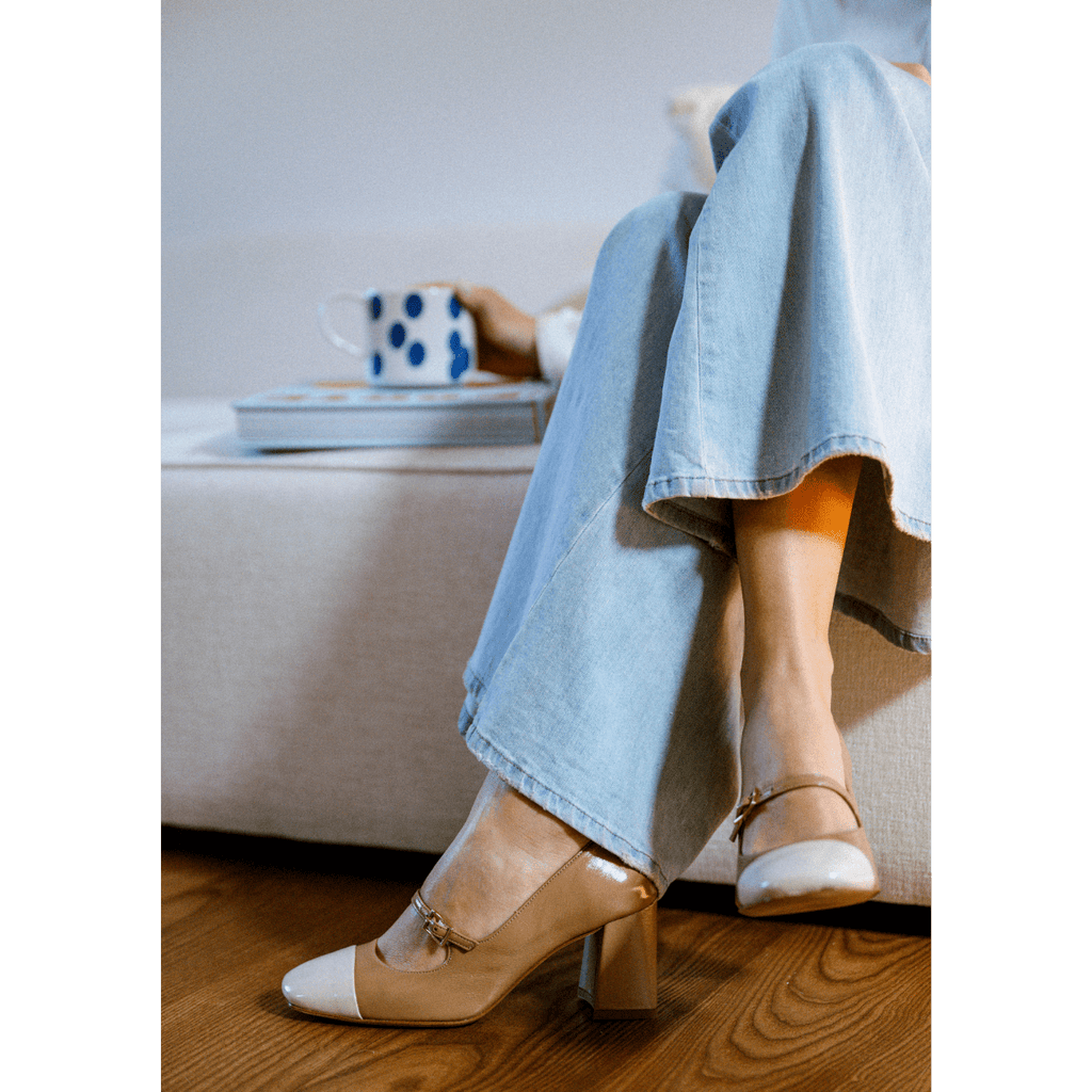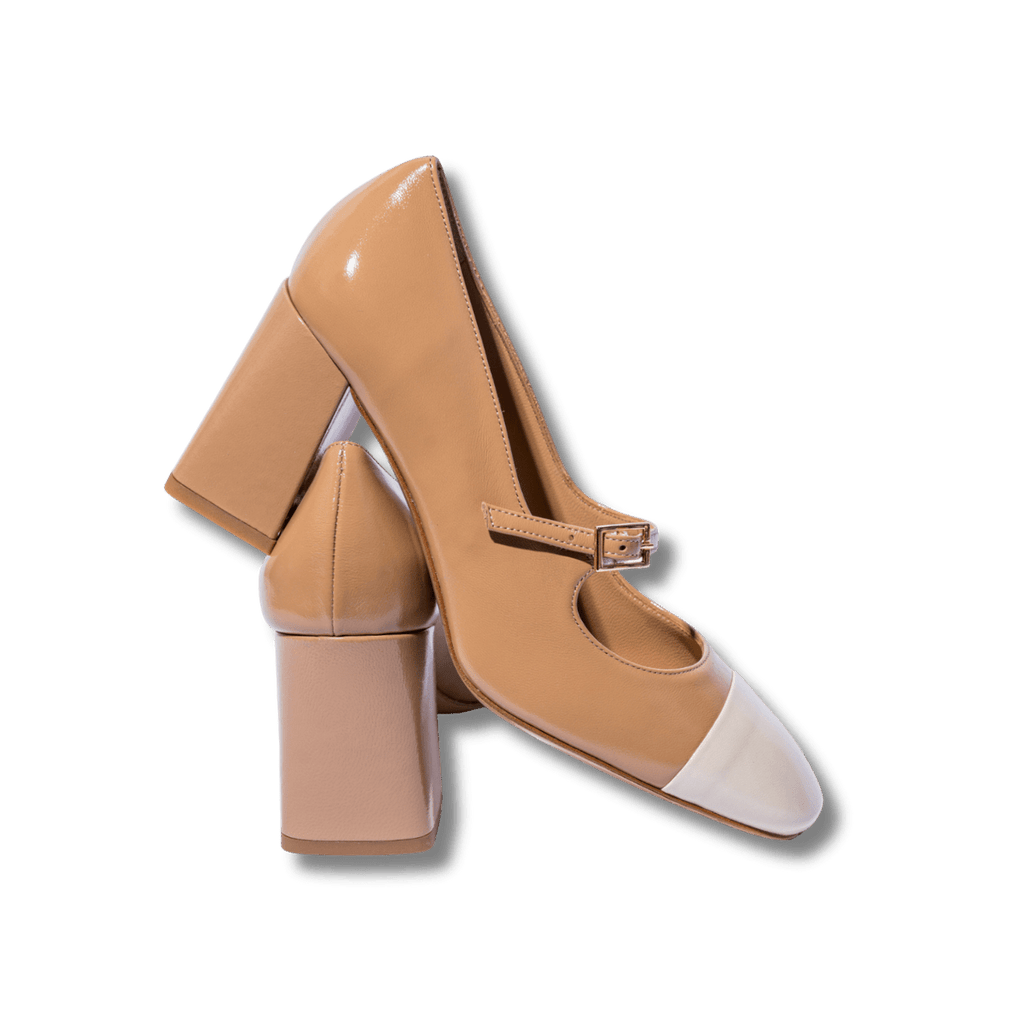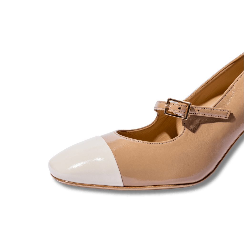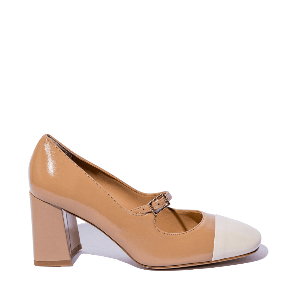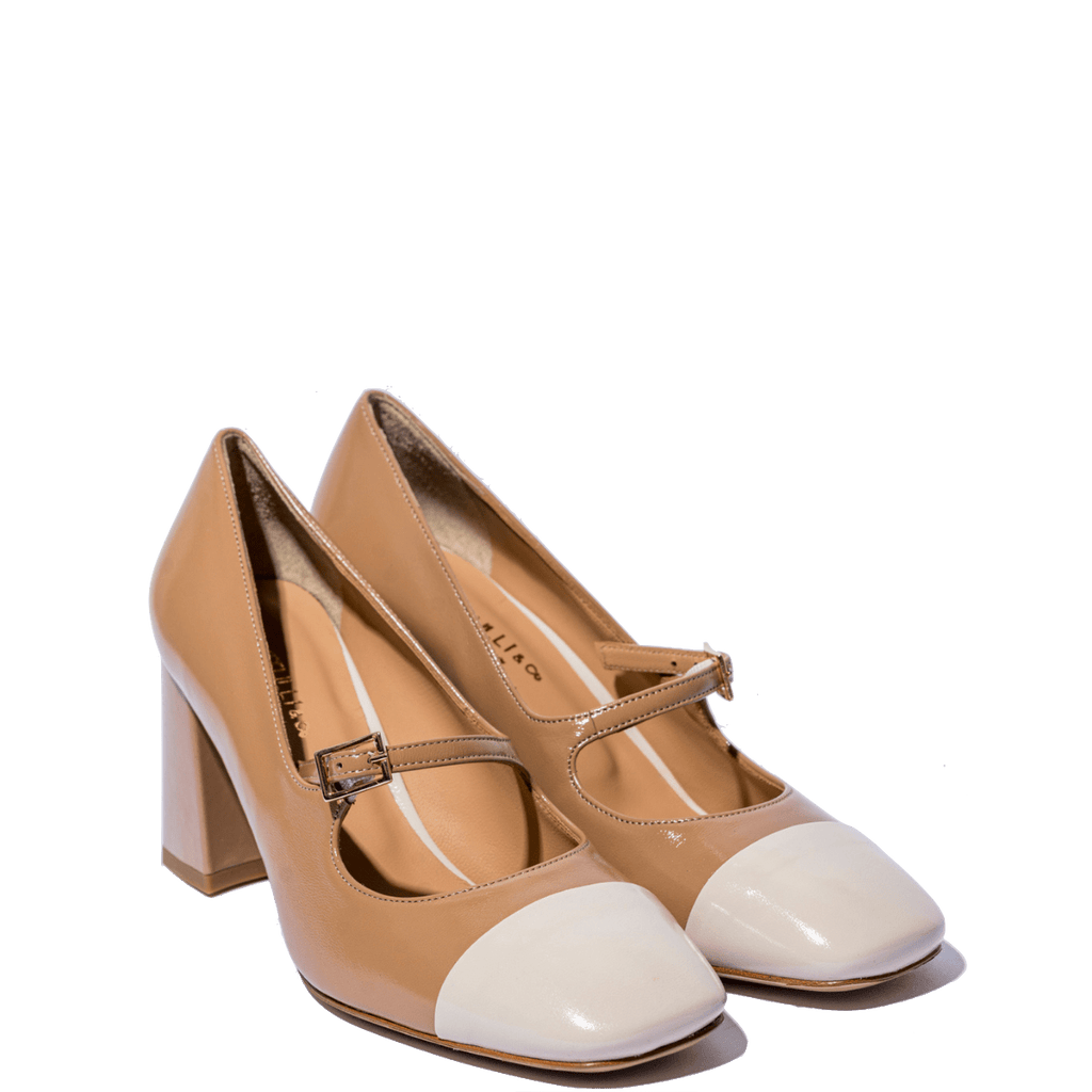 Décolleté dalla forma squadrata realizzati artigianalmente a Napoli con i miglior pellami e materiali. Tomaia in pelle nappa verniciata color biscotto, con puntale a contrasto, color vaniglia. Cinturino regolabile sul collo del piede; tacco largo, di altezza 7 cm, fondo in cuoio. Soletta in pelle morbida, leggermente ammortizzata