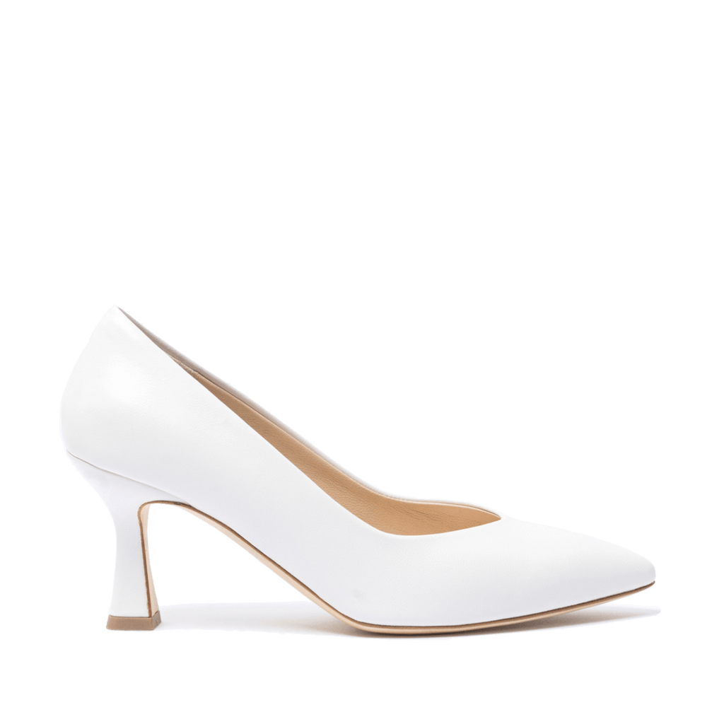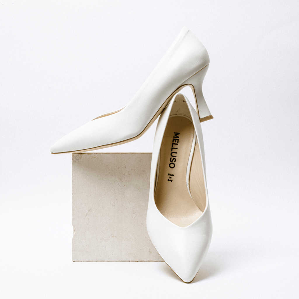Décolleté realizzati in Italia dallo storico calzaturificio napoletano Melluso. Tomaia in pelle morbida bianca, con scollo a cuore. Fodera in pelle; fondo in cuoio. Tacco a rocchetto, che da stabilità, di altezza 7.5 cm e larghezza 2 cm