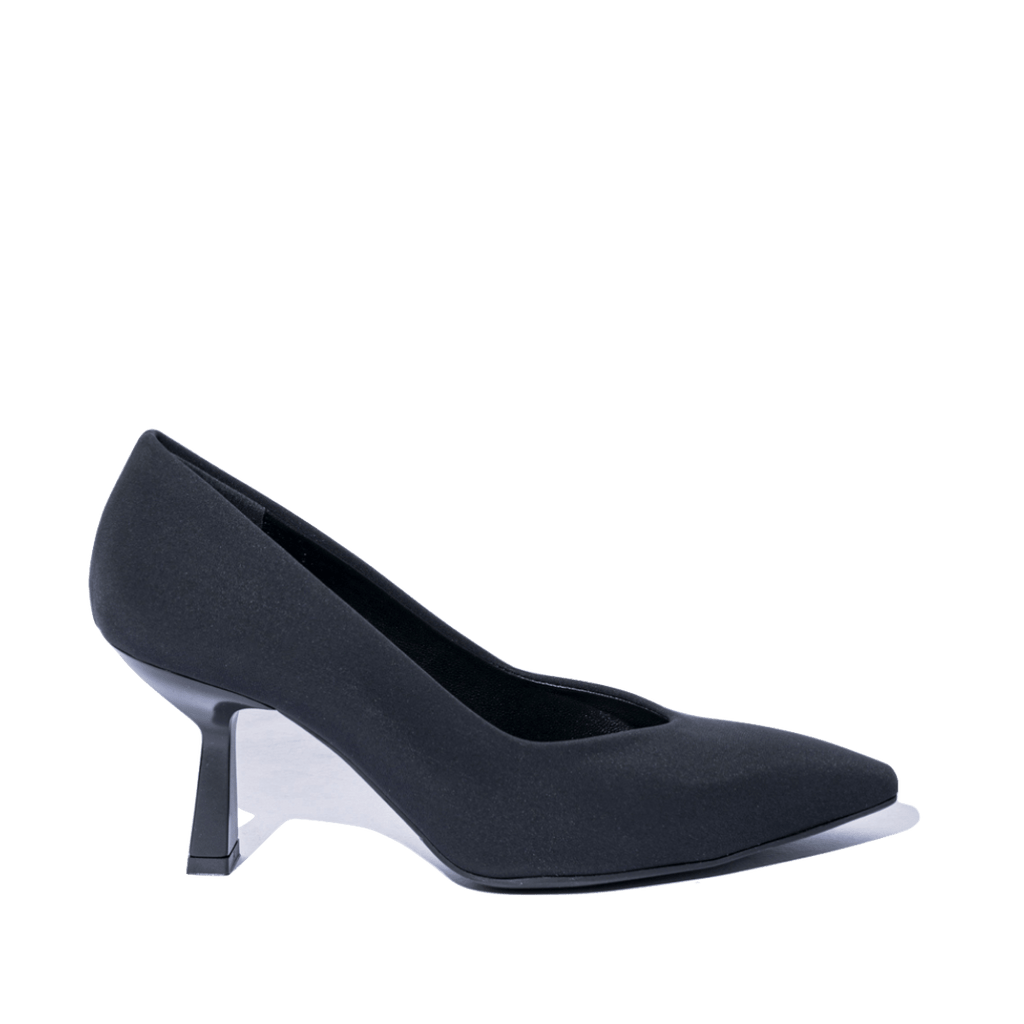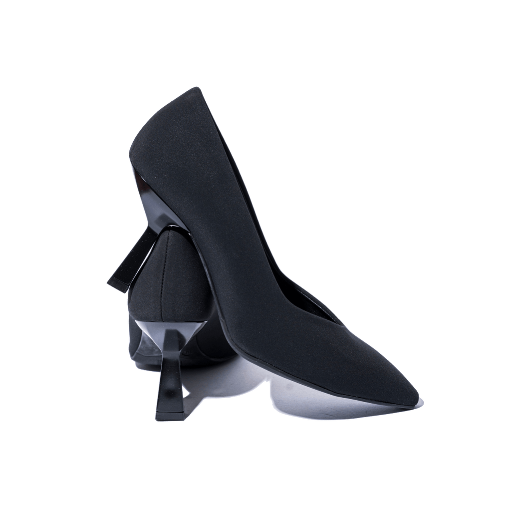 Décolleté dalla forma affusolata e la scollatura a cuore, realizzati in Italia, dallo storico calzaturificio napoletano Melluso. Tomaia in tessuto traspirante, elasticizzato nero; fodera interna in pelle. Fondo in gomma sottile e flessibile, con tacco a rocchetto, che da stabilità, di altezza 8 cm; soletta in pelle, leggermente imbottita, che offre una comoda calzata