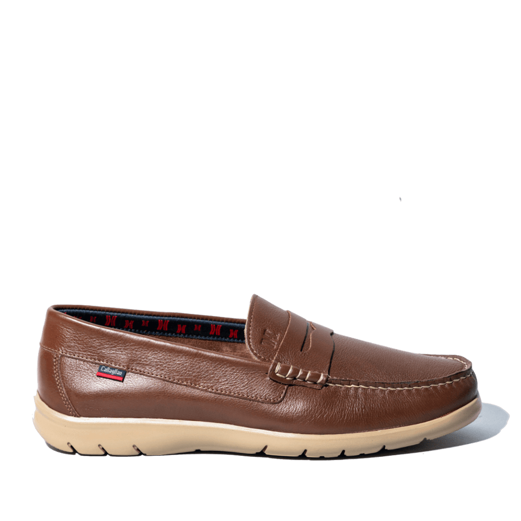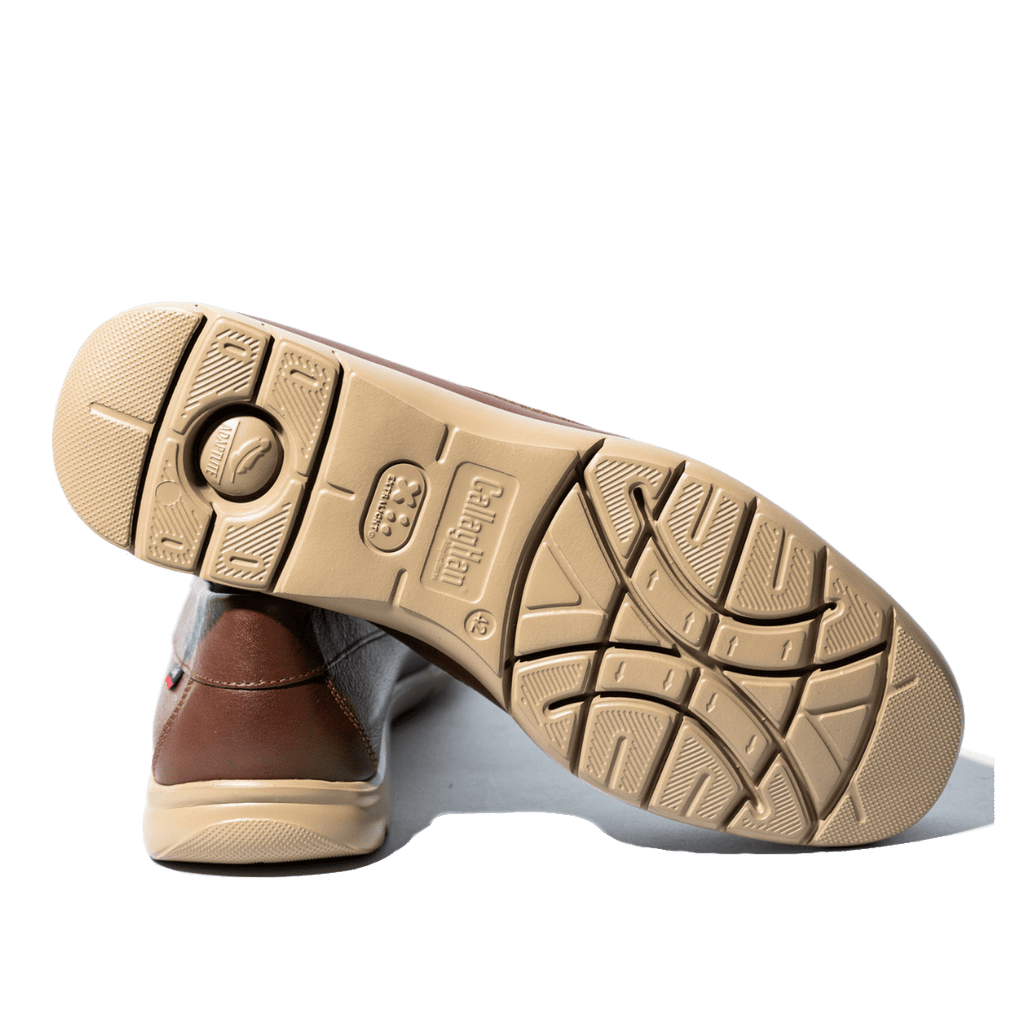 Mocassini leggeri, che si adattano al piede e al suo aumento di larghezza quando si cammina (dai 5 mm agli 8 mm). La tomaia è in pelle marrone, leggermente martellata; l'interno sfoderato, con liner in tessuto tecnico traspirante, antibatterico e antiodore. Plantare ammortizzato, estraibile; suola in gomma flessibile, con altezza del tacco di 2.5 cm