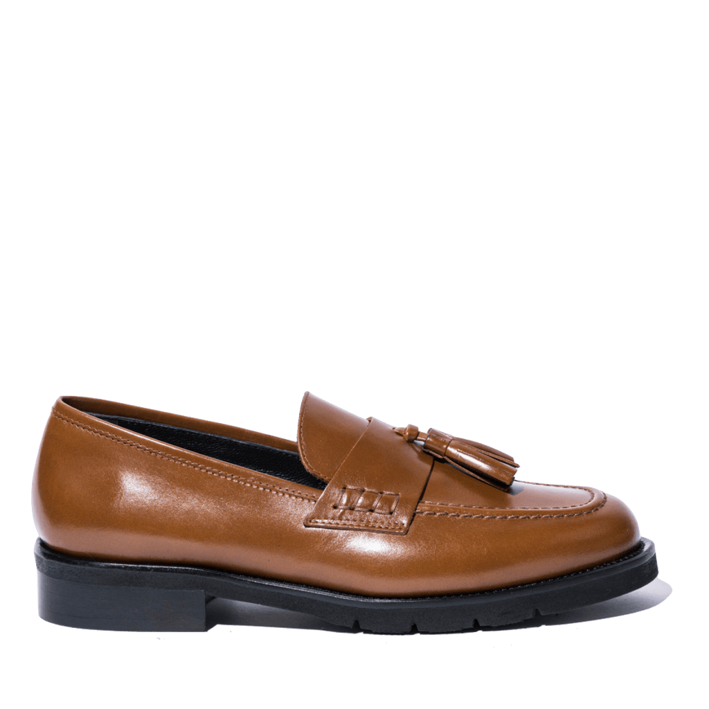 Dalla forma leggermente affusolata, in pelle morbida color cuoio, con nappine, foderati in pelle. Suola in gomma, flessibile e antiscivolo. Soletta in pelle con leggera imbottitura.
