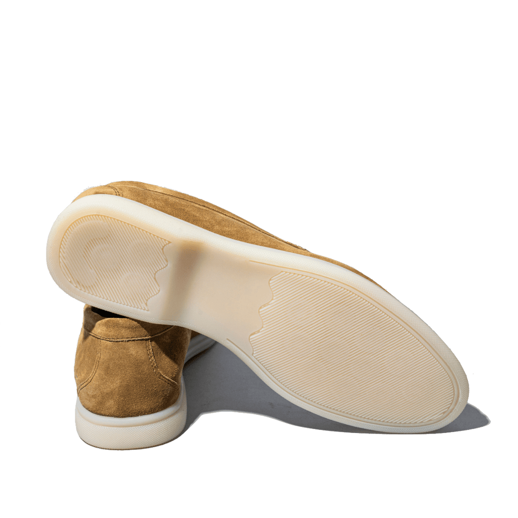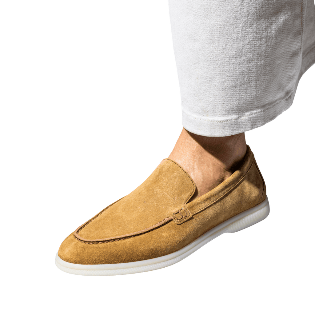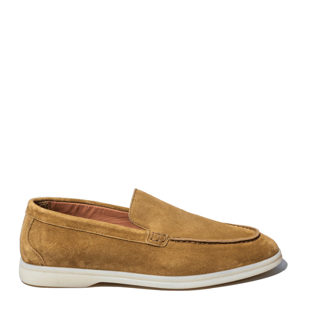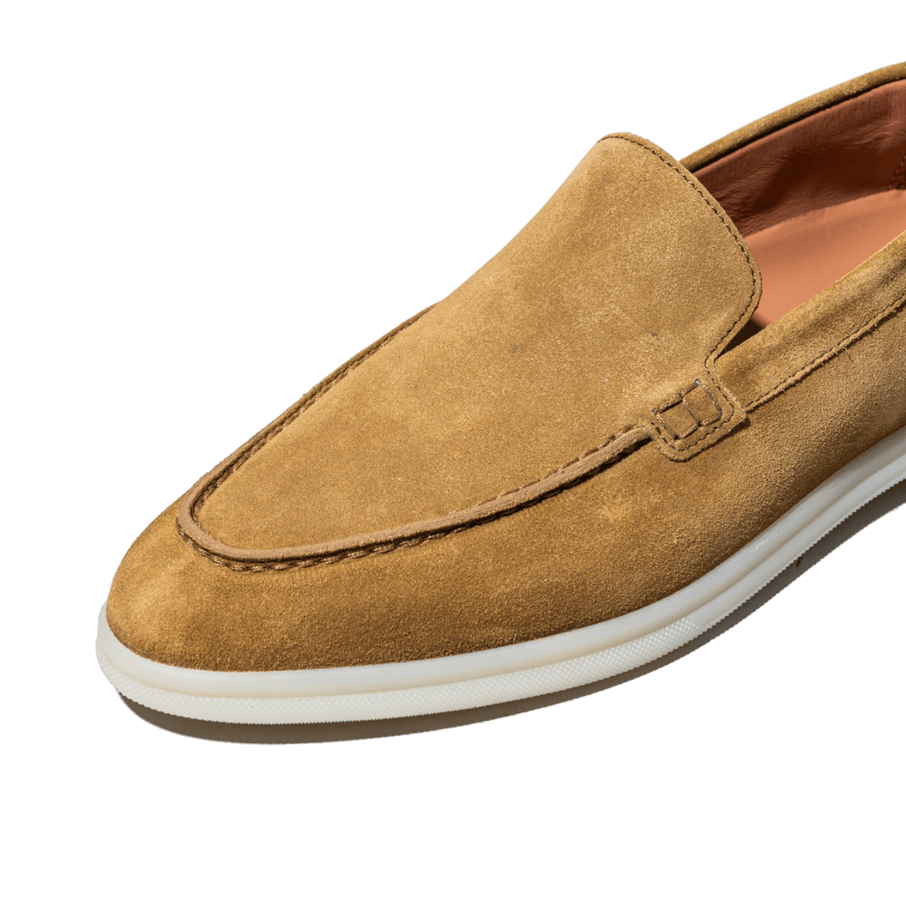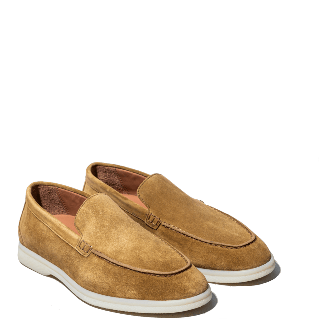 Mocassini comodi, dalla forma leggermente affusolata, di origine marchigiana. Tomaia in pelle scamosciata color tabacco. Interno foderato in pelle. Fondo in gomma flessibile; plantare in pelle estraibile, leggermente imbottito. Realizzati con l'impiego di pellami e materiali pregiati.