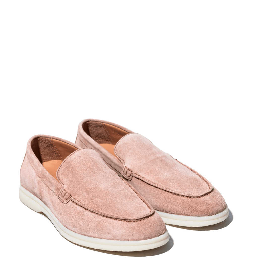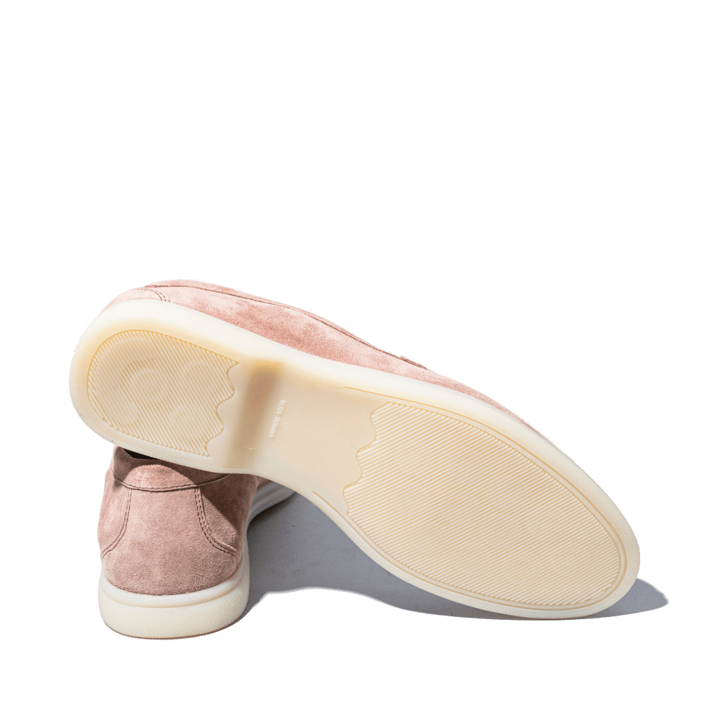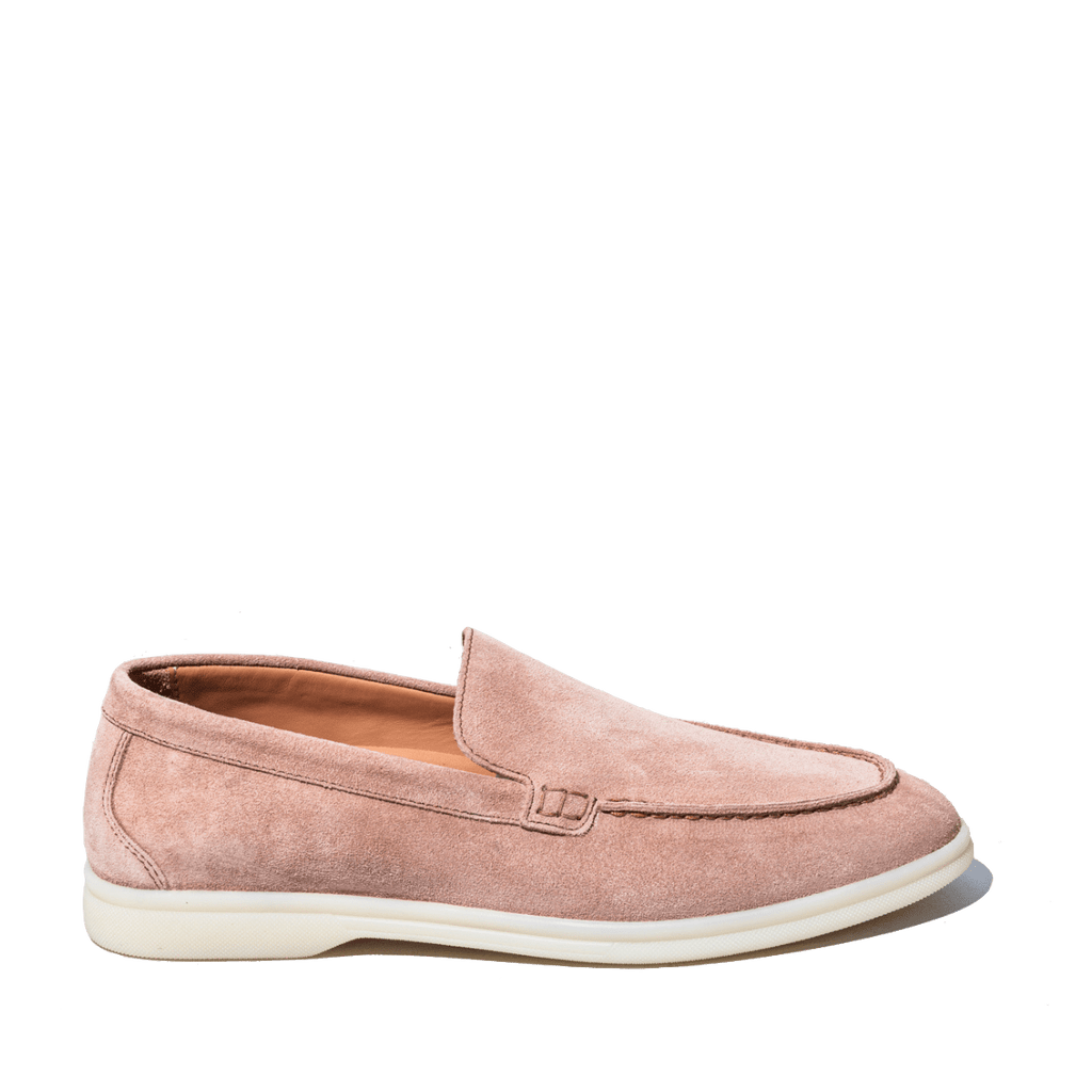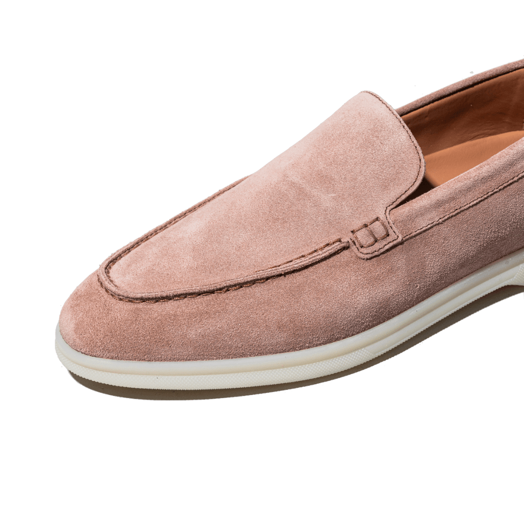 Mocassini comodi, dalla forma leggermente affusolata, di origine marchigiana. Tomaia in pelle scamosciata color rosa malva. Interno foderato in pelle. Fondo in gomma flessibile; plantare in pelle estraibile, leggermente imbottito. Realizzati con l'impiego di pellami e materiali pregiati.