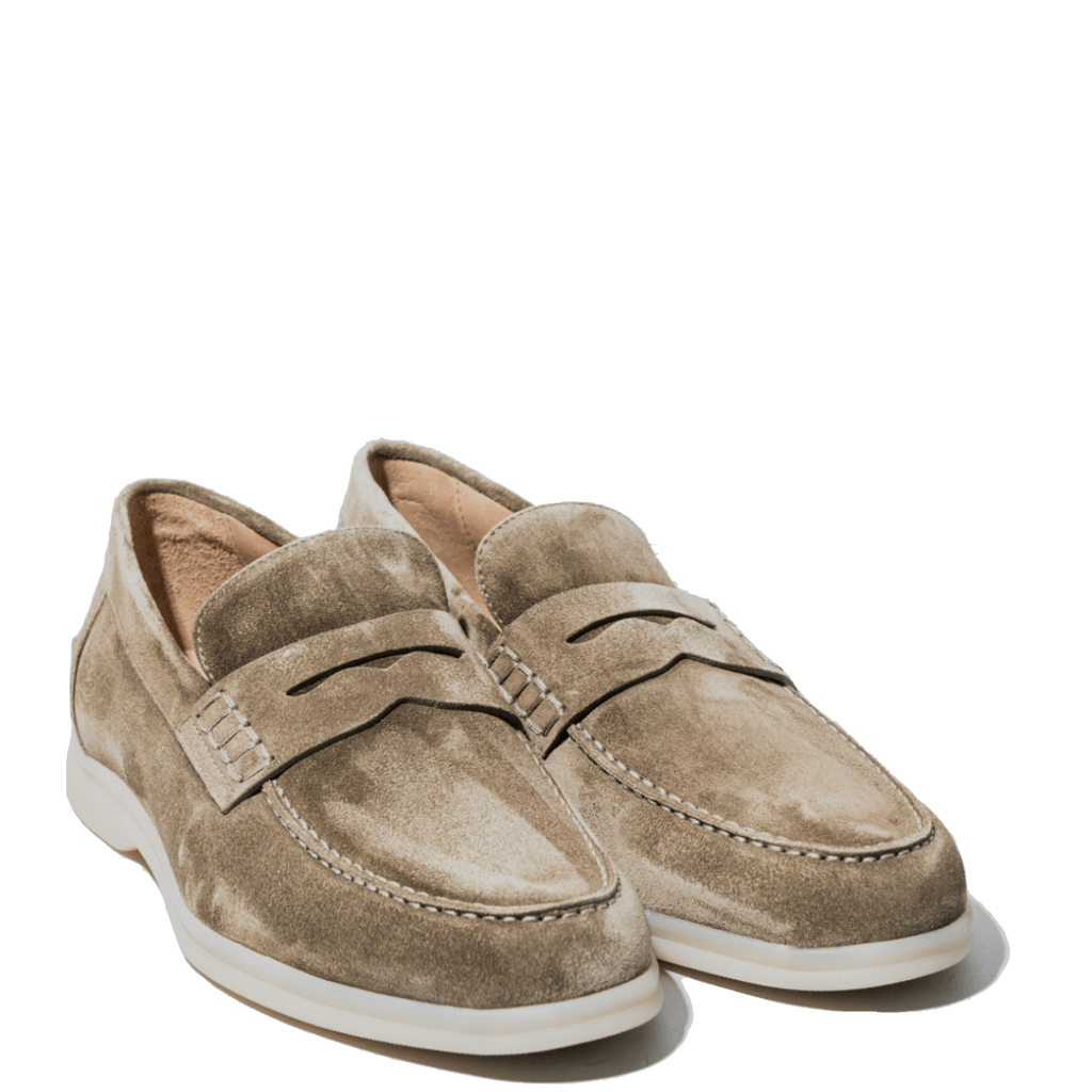 Mocassini comodi, dalla forma leggermente affusolata, di origine marchigiana. Tomaia in pelle scamosciata beige. Interno foderato in pelle. Fondo in gomma flessibile; plantare in pelle ESTRAIBILE, leggermente imbottito. Realizzati con l'impiego di pellami e materiali pregiati.