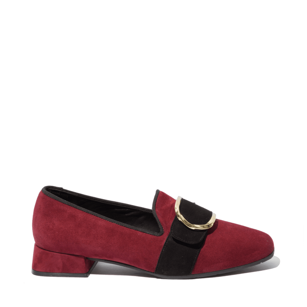 Pantofoline eleganti, dalla punta squadrata, realizzate dallo storico calzaturificio campano. Tomaia in pelle scamosciata bordeaux, impreziosita da una fibbia dorata su un'elegante fascia in camoscio nera. Fodera interna in pelle, soletta in pelle leggermente imbottita; fondo in gomma sottile con tacco squadrato di 2 cm