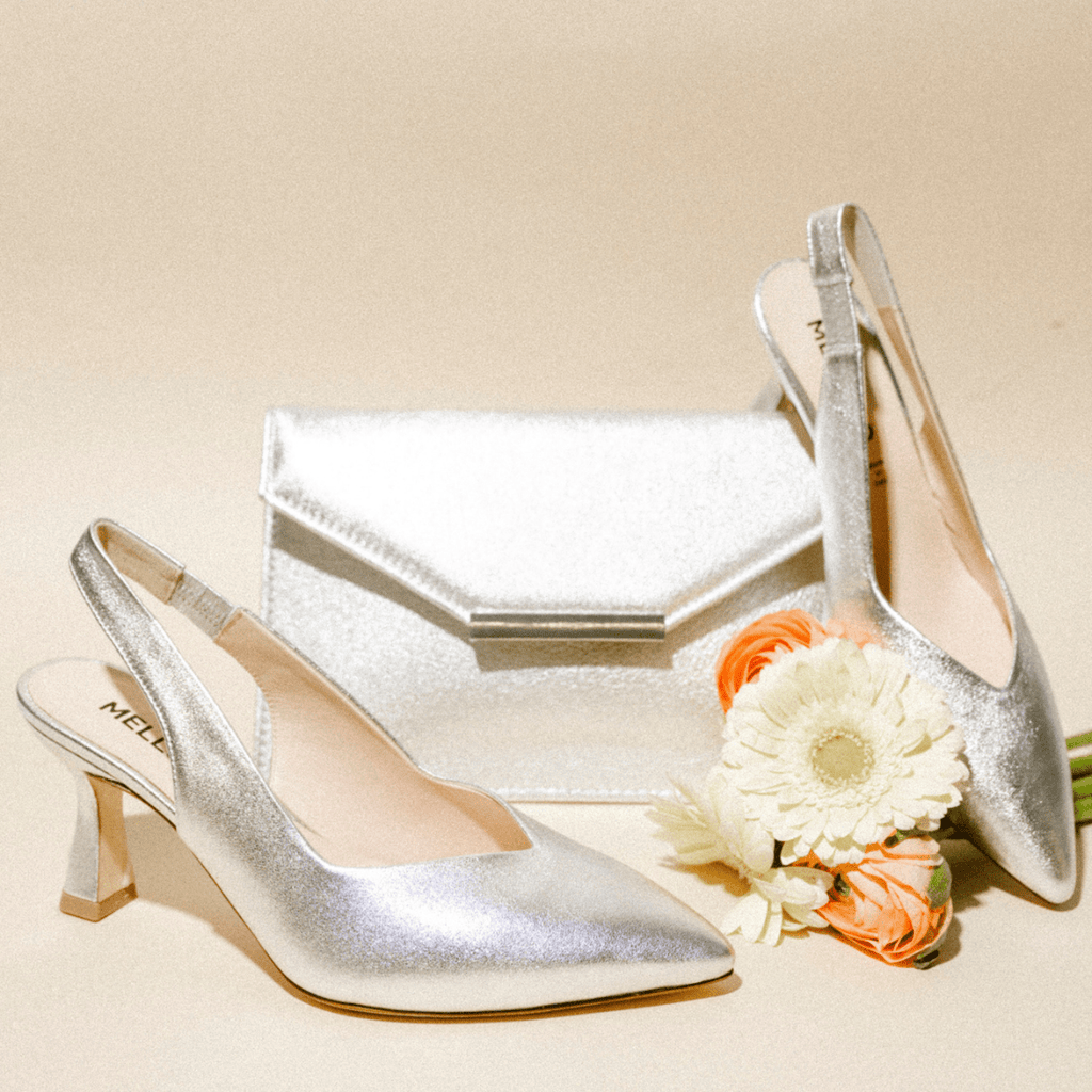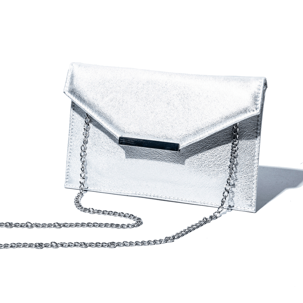 Borsa piccola in pelle morbida argento, con tracolla e inserti, tono su tono. Fodera in tessuto; chiusura con bottone magnetico