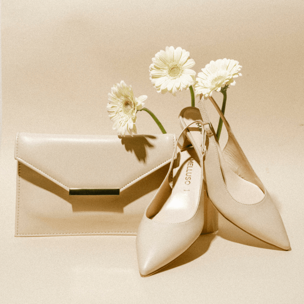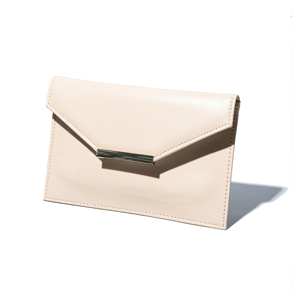 Borsa piccola, in pelle morbida color cipria, con tracolla e inserto dorati. Fodera in tessuto; chiusura con bottone magnetico