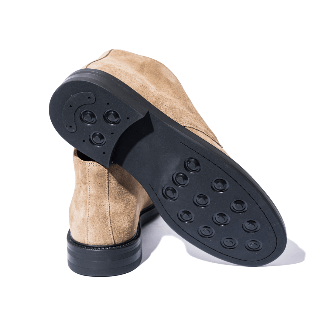Polacchini classici Saxone, due fori, in pelle robusta scamosciata color tortora. Interno foderato in pelle. Fondo in gomma con bolli antiscivolo