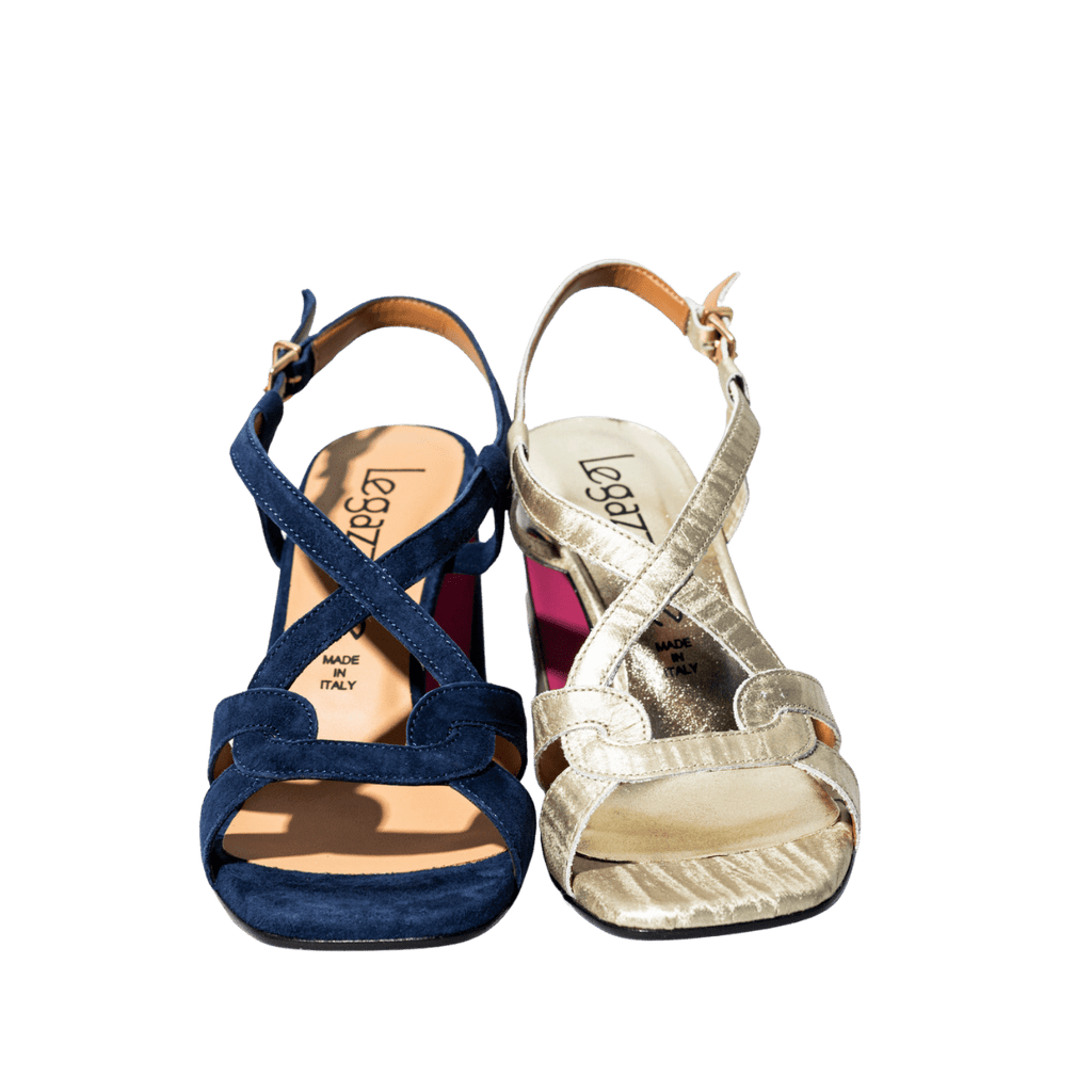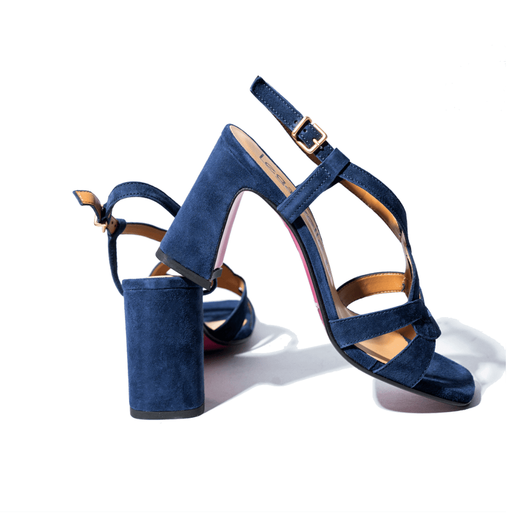 Sandali con tomaia avvolgente, realizzati dallo storico calzaturificio campano. Pelle scamosciata blu; tacco grosso, di altezza 7 cm. Sottopiede in pelle, leggermente imbottito; cinturino regolabile. Fondo in cuoio