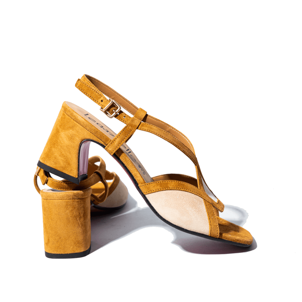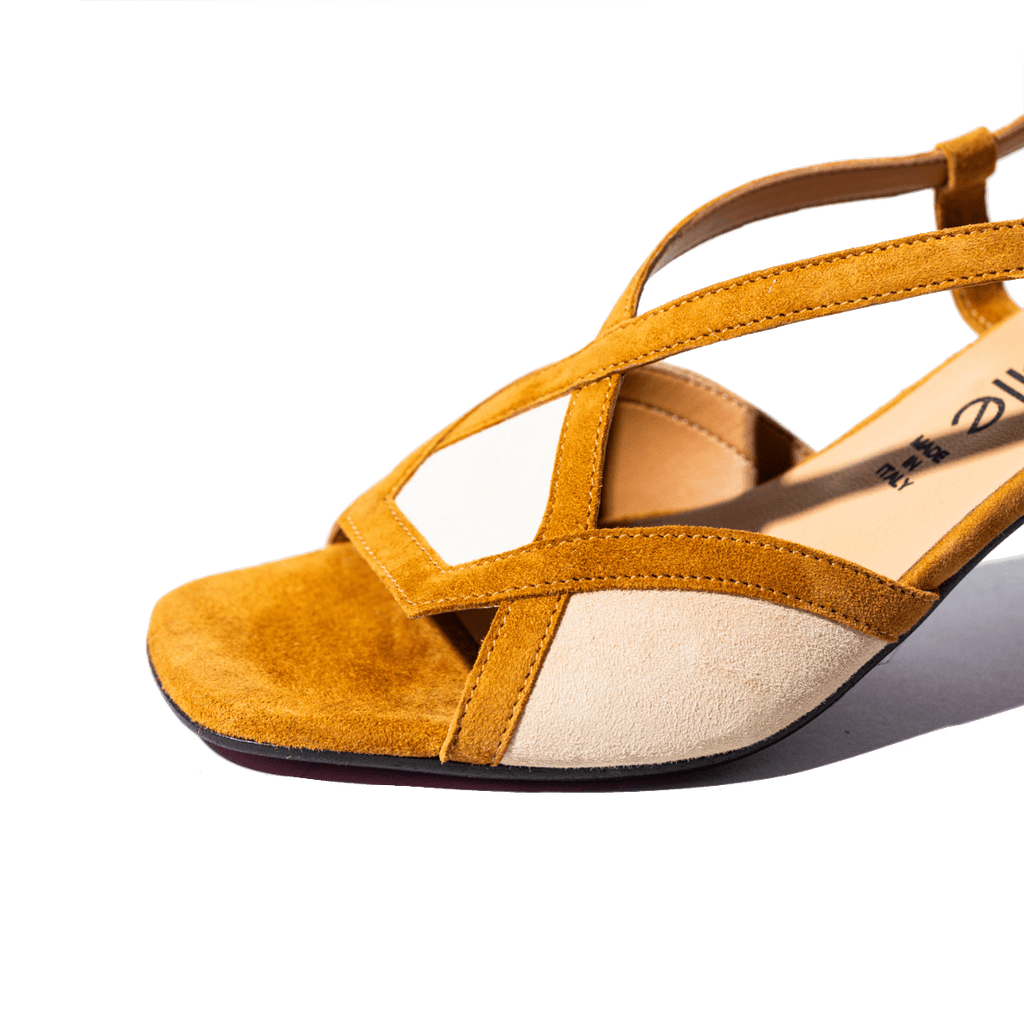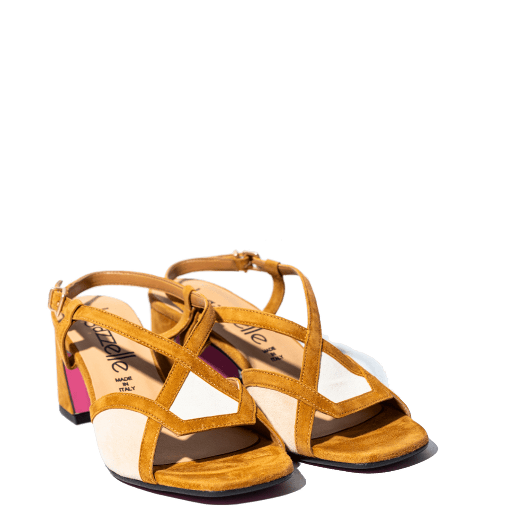 Sandali dalla linea semplice e avvolgente, realizzati dallo storico calzaturificio campano. Tomaia in pelle scamosciata colori tabacco e beige con cinturino regolabile. Tacco largo, di altezza 6 cm. Sottopiede in pelle, leggermente imbottito. Fondo in cuoio