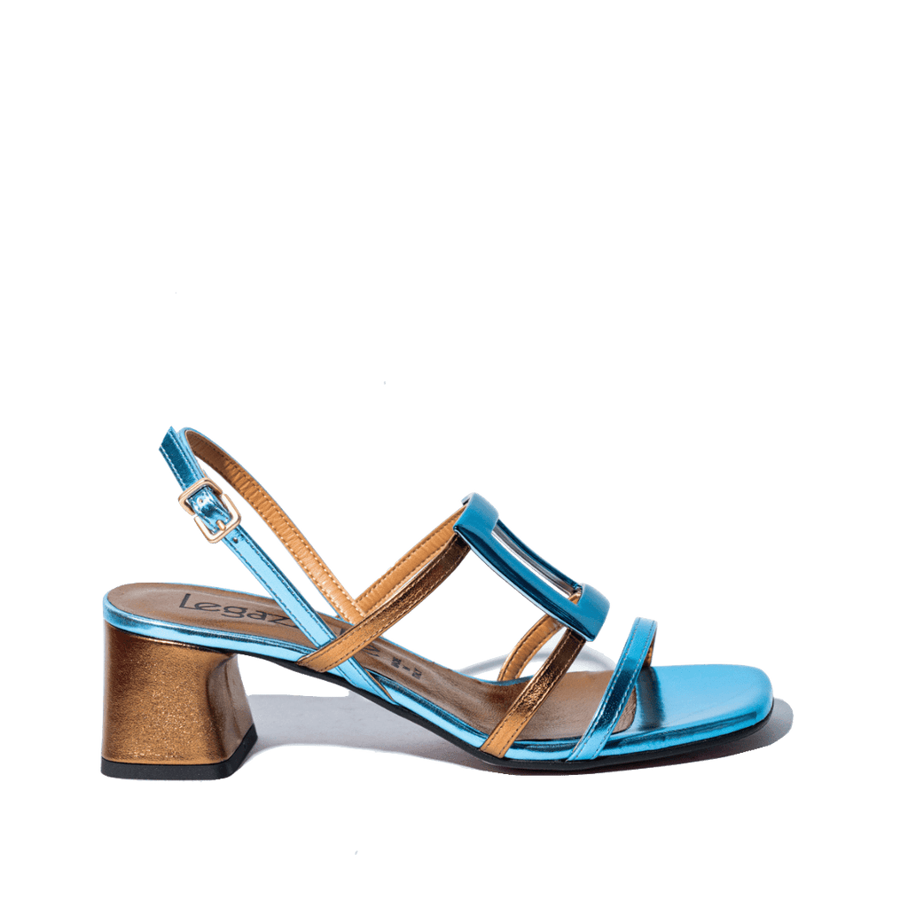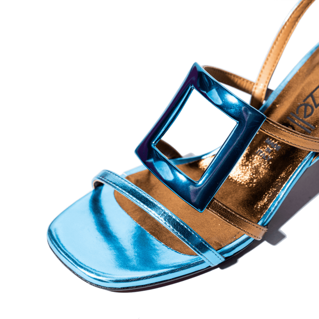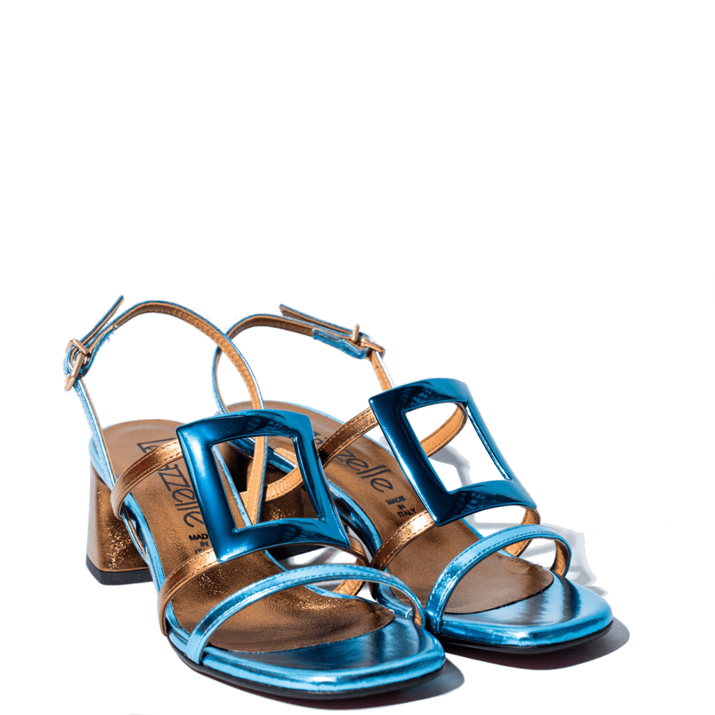 Sandali con fibbia geometrica, realizzati dallo storico calzaturificio campano. Pelle laminata turchese e bronzo; tacco grosso, di altezza 5 cm. Sottopiede in pelle, leggermente imbottito; cinturino regolabile. Fondo in cuoio