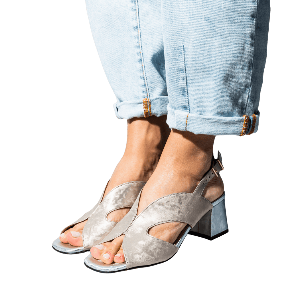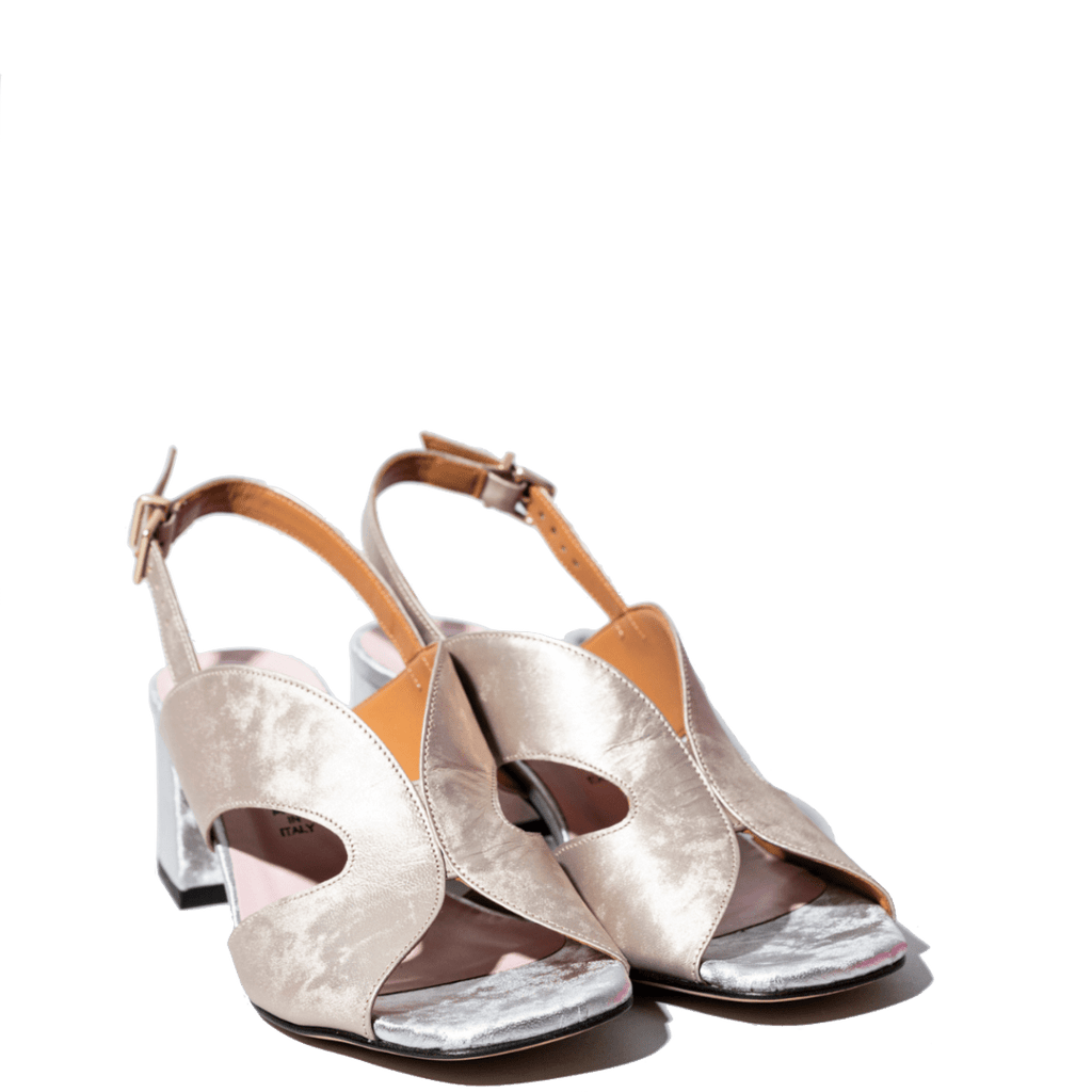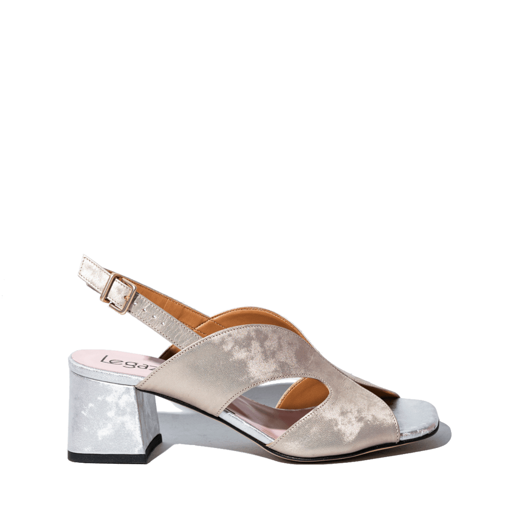 Sandali avvolgenti, realizzati dallo storico calzaturificio campano. Pelle laminata, dalla texture cangiante, color platino chiaro, con tacco e soletta argentati. Fodera pelle; tacco grosso, di altezza 6 cm. Sottopiede in pelle, leggermente imbottito; cinturino regolabile. Fondo in cuoio
