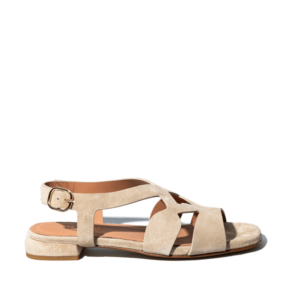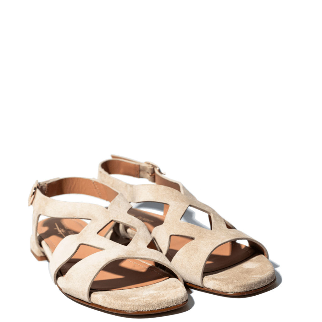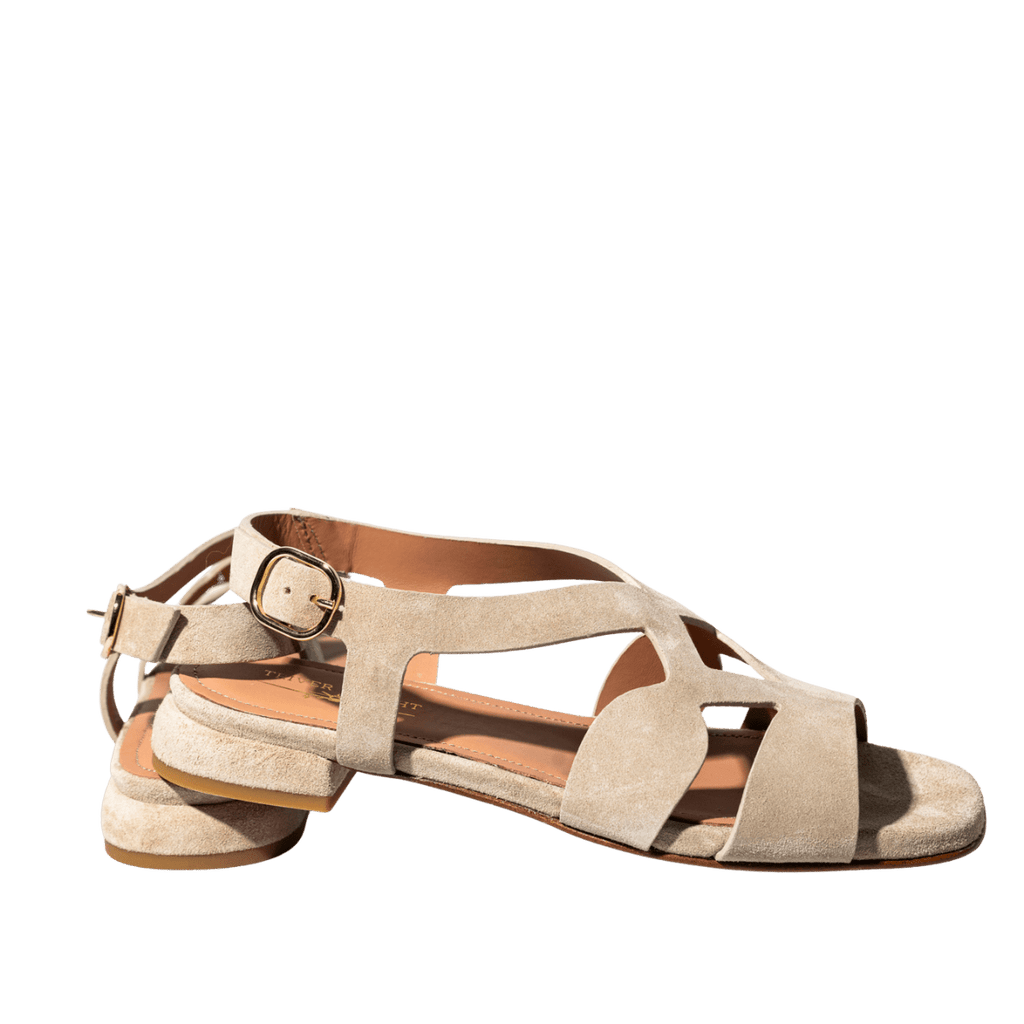 Sandali comodi, avvolgenti, dalla forma squadrata, di origine marchigiana. Tomaia in pelle scamosciata, morbida, beige. Fondo in cuoio con gomma sottile, antiscivolo. Cinturino regolabile; plantare in pelle leggermente imbottito. Realizzati con l'impiego di pellami e materiali pregiati.