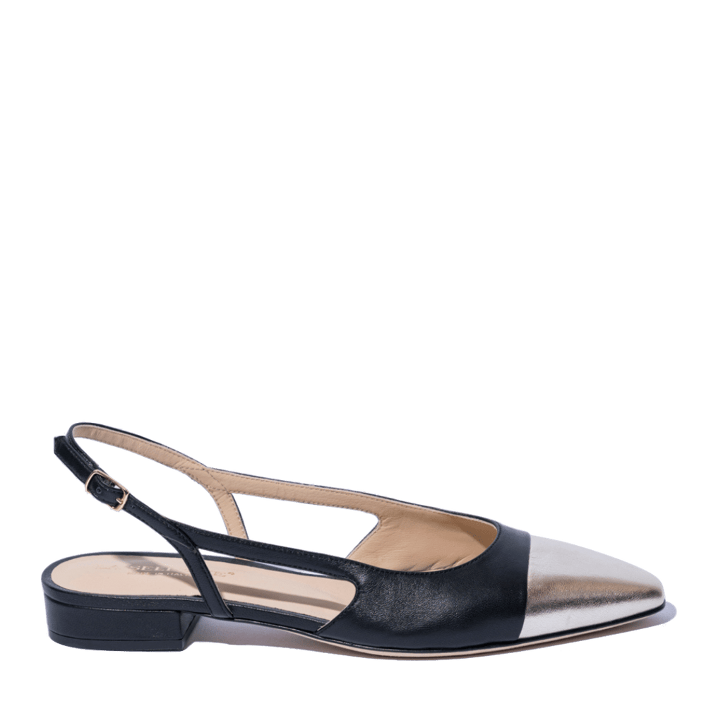 Modello "chanel", chiuso in punta e aperto sul retro: un classico intramontabile, elegante e allo stesso tempo versatile. Queste slingback sono realizzate artigianalmente dallo storico calzaturificio veneto, La Sellerie. Tomaia in nappa morbida nera con punta in nappa, laminata, dorata. Cinturino regolabile. Foderate in pelle. Fondo in cuoio, con tacco basso di altezza 2 cm