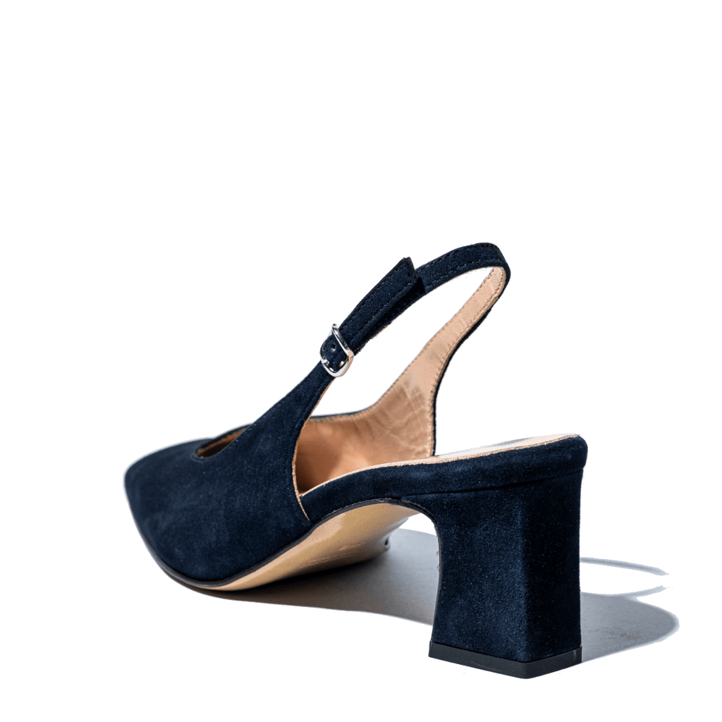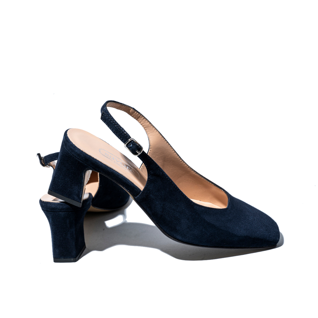 Slingback, chiusi davanti e aperti dietro, con punta squadrata, lavorati artigianalmente in Italia. Tomaia in pelle scamosciata blu, con cinturino regolabile. Interno in fodera pelle e soletta in pelle leggermente imbottita; fondo in cuoio con tacco squadrato di altezza 5.5 cm