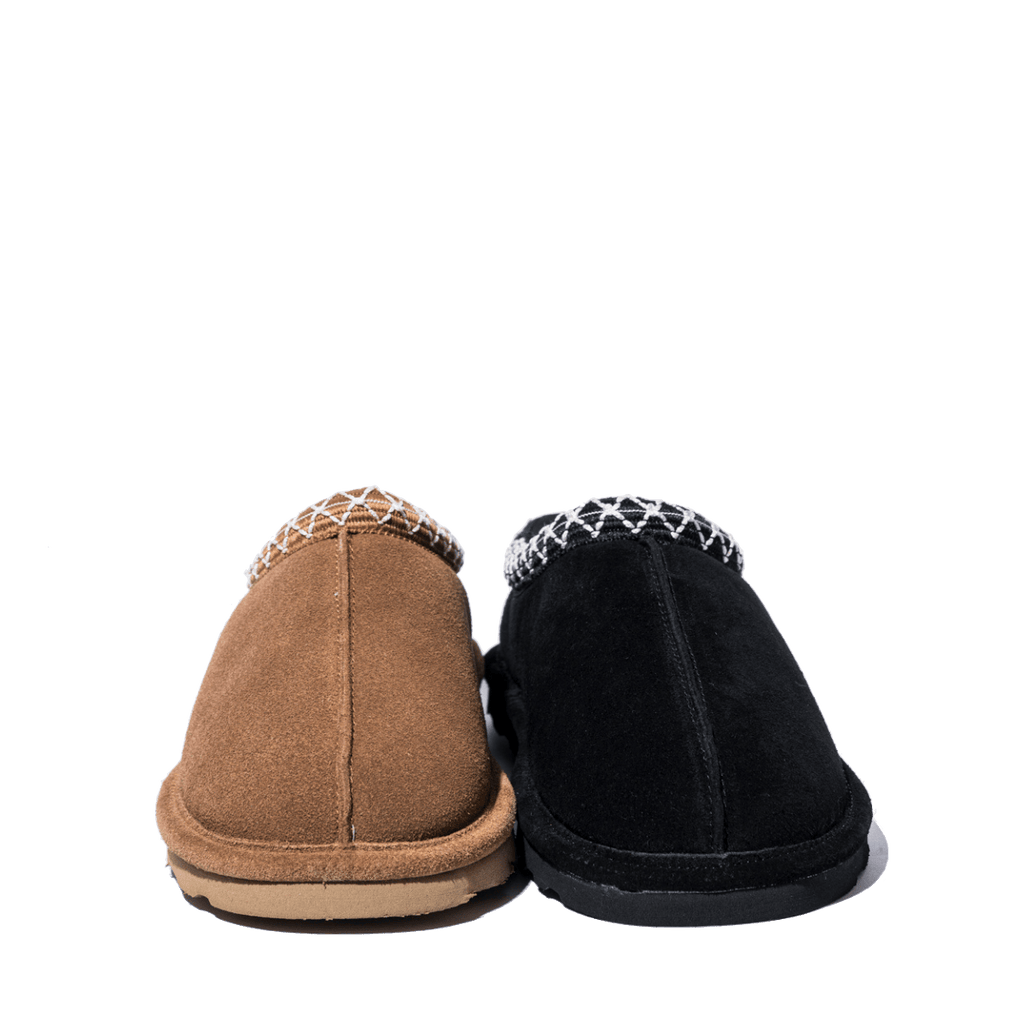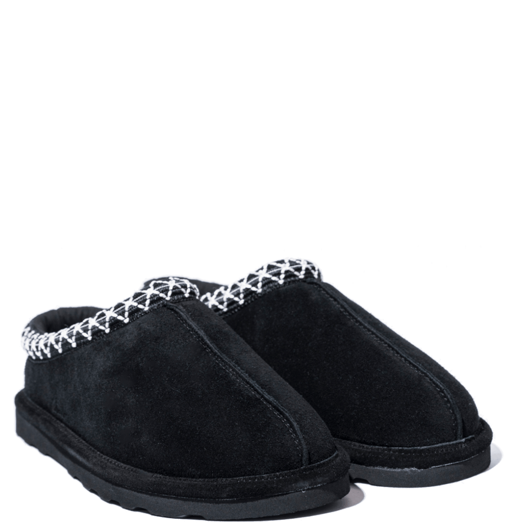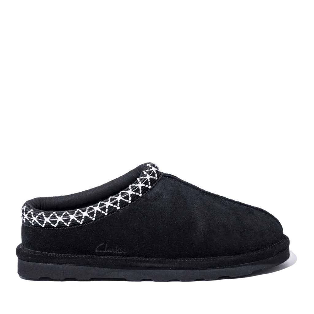 Pantofoline slip-on, imbottite, con tomaia in pelle scamosciata nera ricamata intorno alla caviglia. Sottopiede con leggera imbottitura memory foam, per una comoda ammortizzazione; suola in gomma robusta e flessibile.