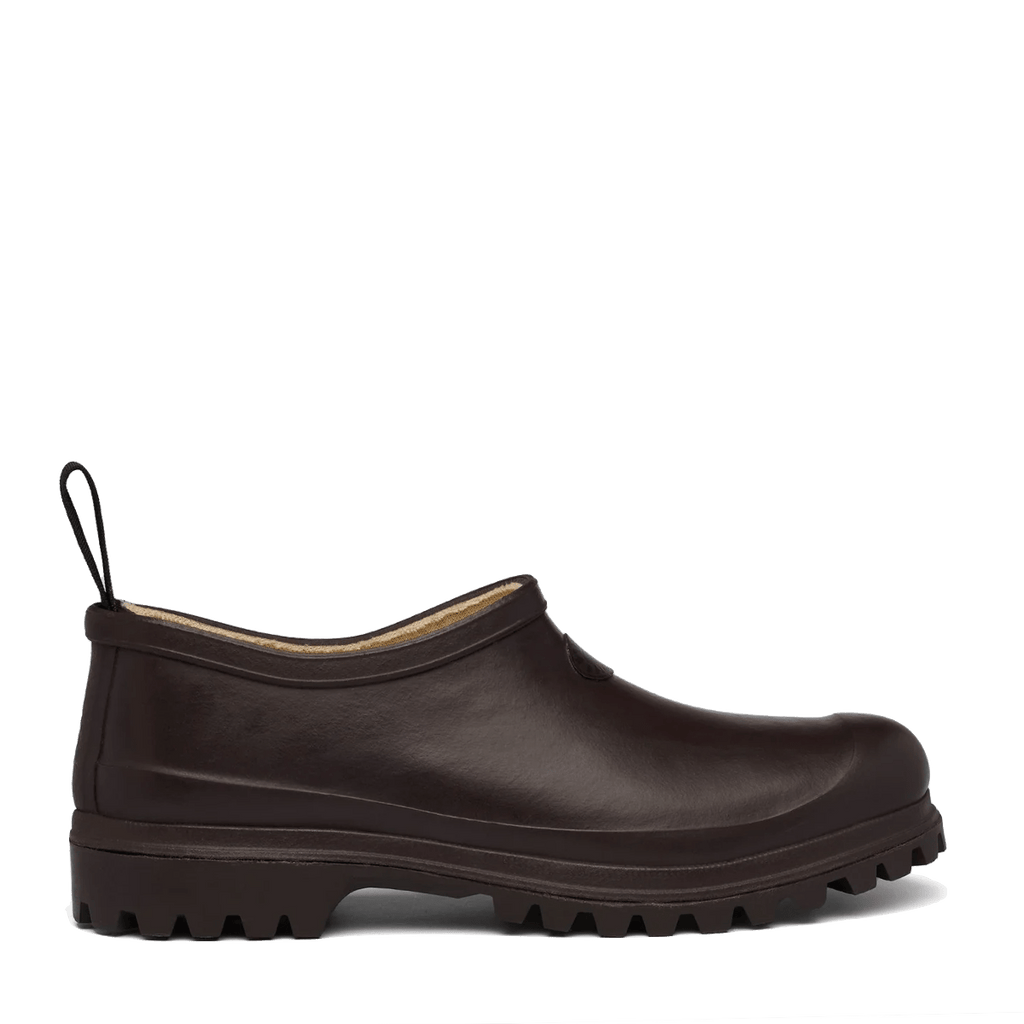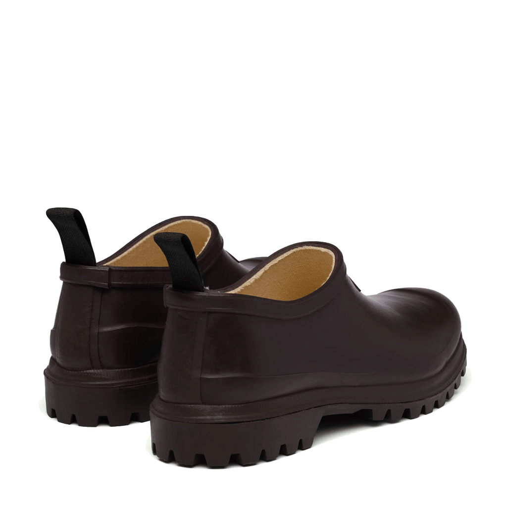 Slip-On molto comode, con tomaia in 100% morbida gomma marrone, e fodera in cotone. Suola in "carro armato" antiscivolo, per una aderenza al terreno ottimale durante le giornate piovose, con tacco di altezza 2.5 cm. Asola sul retro, che facilita l'ingresso del piede. Morbida soletta in cotone, rimovibile