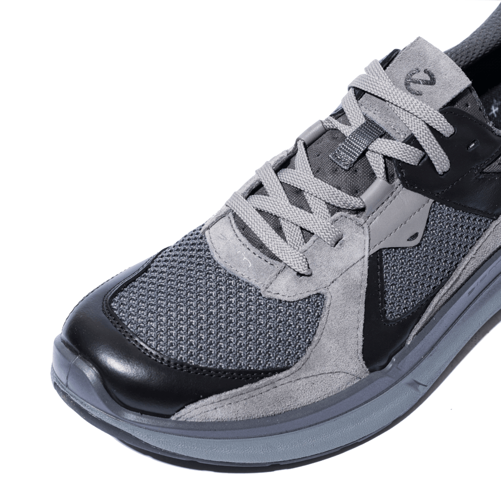 Sneakers con tomaia in tessuto tecnico, traspirante e inserti in pelle, liscia e scamosciata, dai colori del grigio e del nero. Adatte al trekking, grazie alla leggerezza della struttura e della suola in gomma. Soletta morbida e ultraleggera, ESTRAIBILE, dotata di tecnologia Ecco, ammortizzante e anatomica: la scarpa si adatta perfettamente alla forma del piede