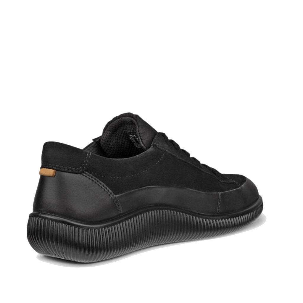 Sneakers impermeabili, con tomaia in morbida pelle nabuck, nera, bordatura in pelle, tono su tono, ed interno in tessuto traspirante. Chiusura con lacci in tessuto. Tecnologia Ecco Fluidform, flessibile e anatomica: la scarpa si adatta perfettamente alla forma del piede. Suola in gomma leggera, ultra flessibile, in tinta. Ideali per camminare a lungo, mantenendo raffinatezza in un look casual