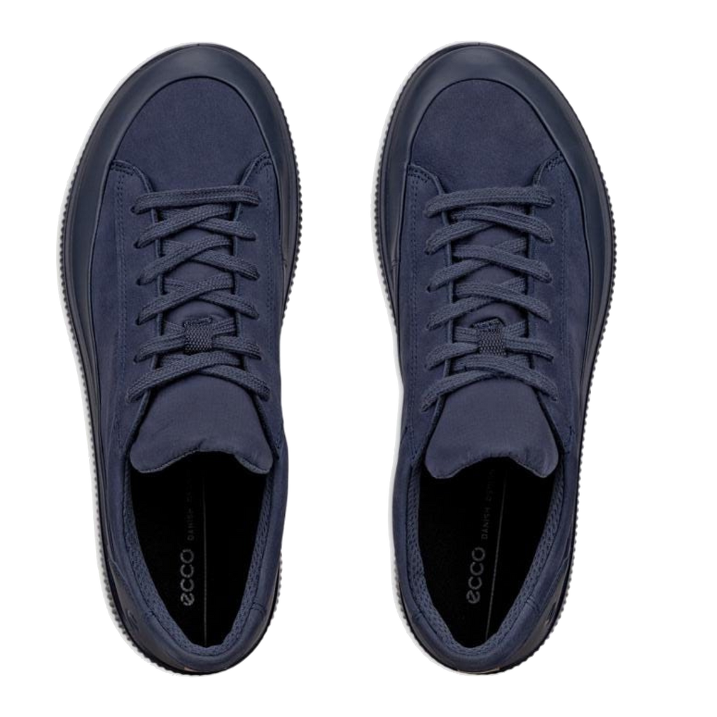 Sneakers impermeabili, con tomaia in morbida pelle nabuck, blu, bordatura in pelle, tono su tono, ed interno in tessuto traspirante. Chiusura con lacci in tessuto. Tecnologia Ecco Fluidform, flessibile e anatomica: la scarpa si adatta perfettamente alla forma del piede. Suola in gomma leggera, ultra flessibile, in tinta. Ideali per camminare a lungo, mantenendo raffinatezza in un look casual