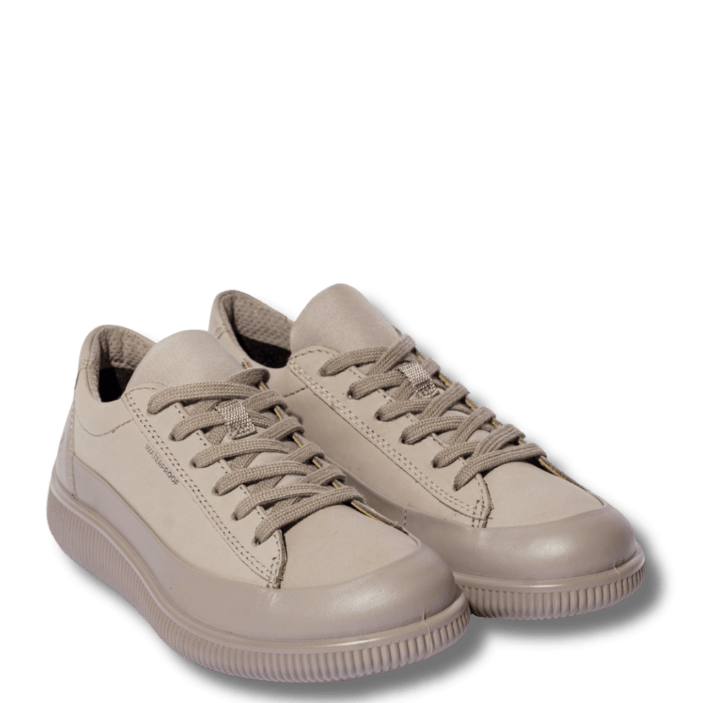 Sneakers impermeabili, con tomaia in morbida pelle nabuck, tortora chiaro, bordatura in pelle, tono su tono, ed interno in tessuto traspirante. Chiusura con lacci in tessuto. Tecnologia Ecco Fluidform, flessibile e anatomica: la scarpa si adatta perfettamente alla forma del piede. Suola in gomma leggera, ultra flessibile, in tinta. Ideali per camminare a lungo, mantenendo raffinatezza in un look casual
