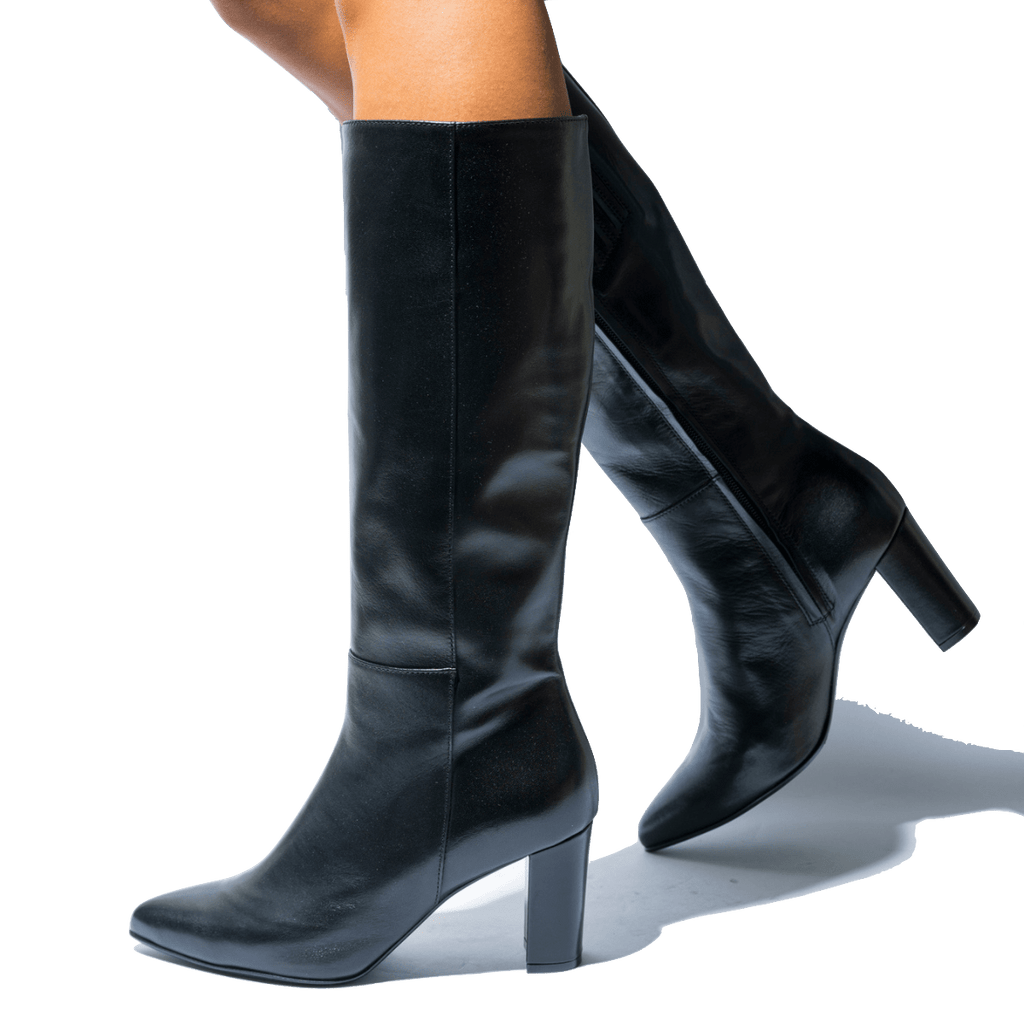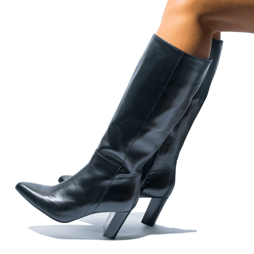 Stivali molto comodi, lavorati artigianalmente in Italia. Tomaia in pelle scamosciata marrone, con cerniera sul lato interno, che facilita l'ingresso del piede, e fascia elasticizzata. Soletta in pelle, leggermente imbottita; fondo in cuoio con mezza gomma sottile, tacco squadrato di altezza 7 cm.