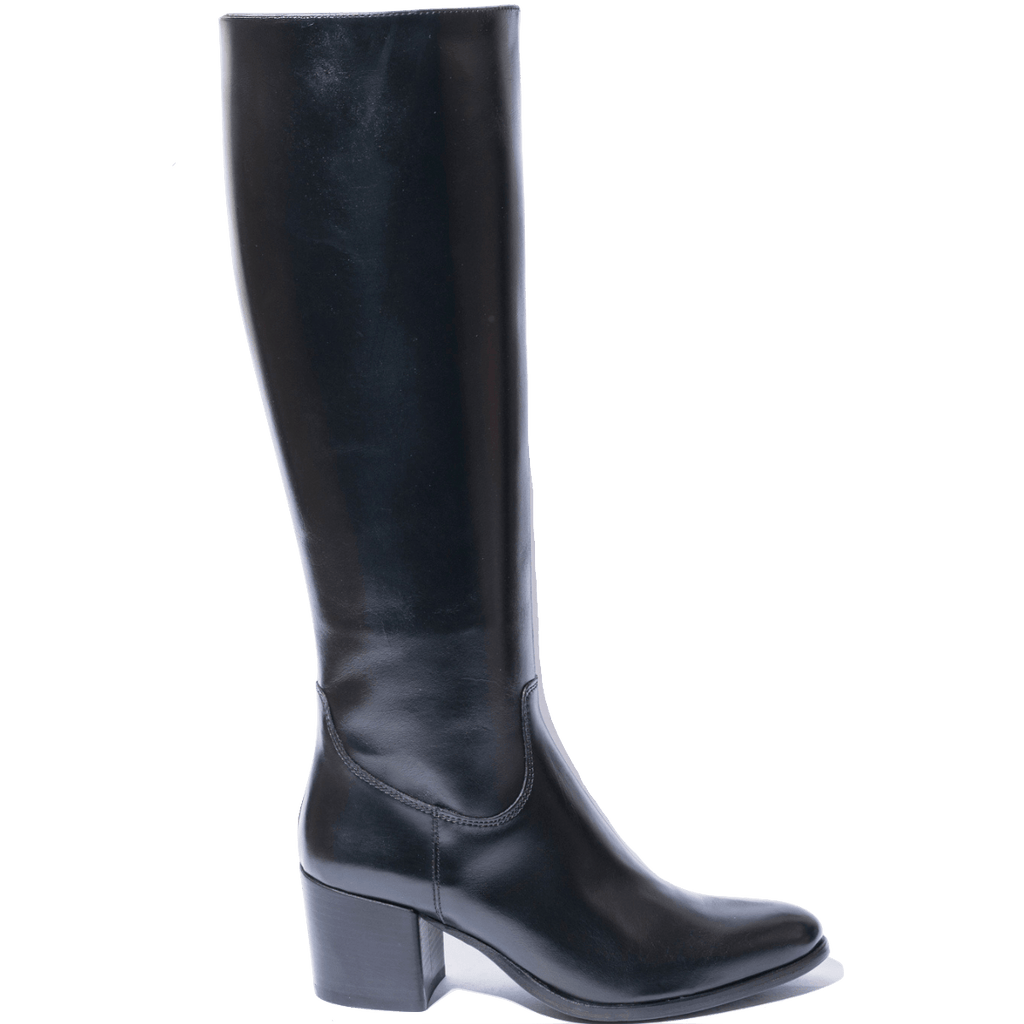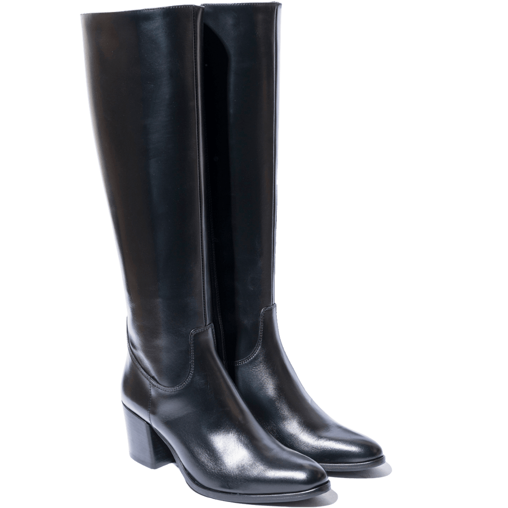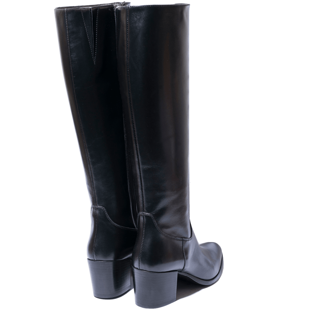 Stivali molto comodi, di origine marchigiana, che riprendono la linea del camperos, mantenendo eleganza e semplicità. Tomaia in pelle trattata, nera, con tacco squadrato di altezza 6 cm. Interno foderato in pelle; cerniera sul lato interno, che facilita l'ingresso del piede. Fondo in cuoio con mezza gomma antiscivolo; plantare in pelle. Realizzati con l'impiego di pellami e materiali pregiati