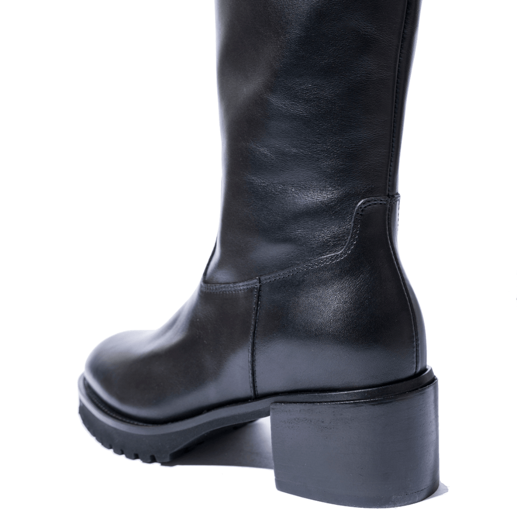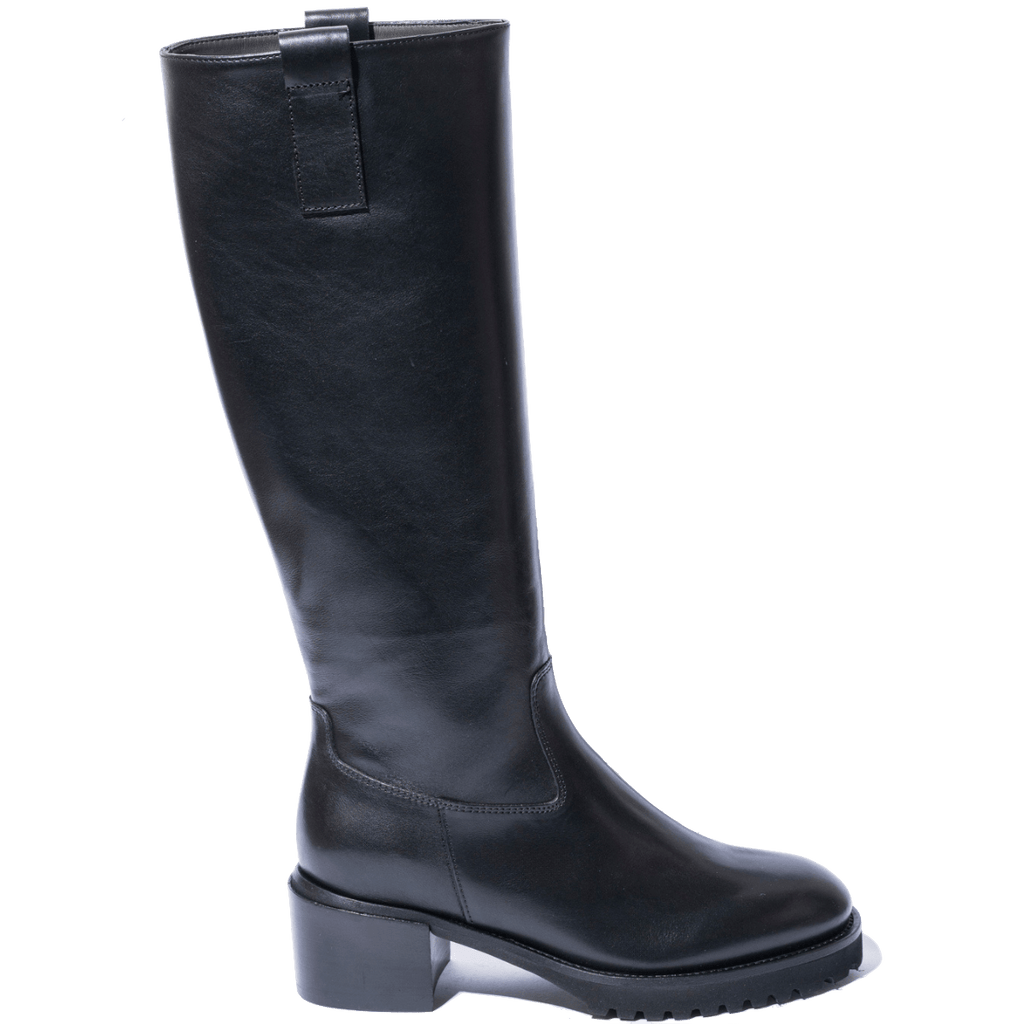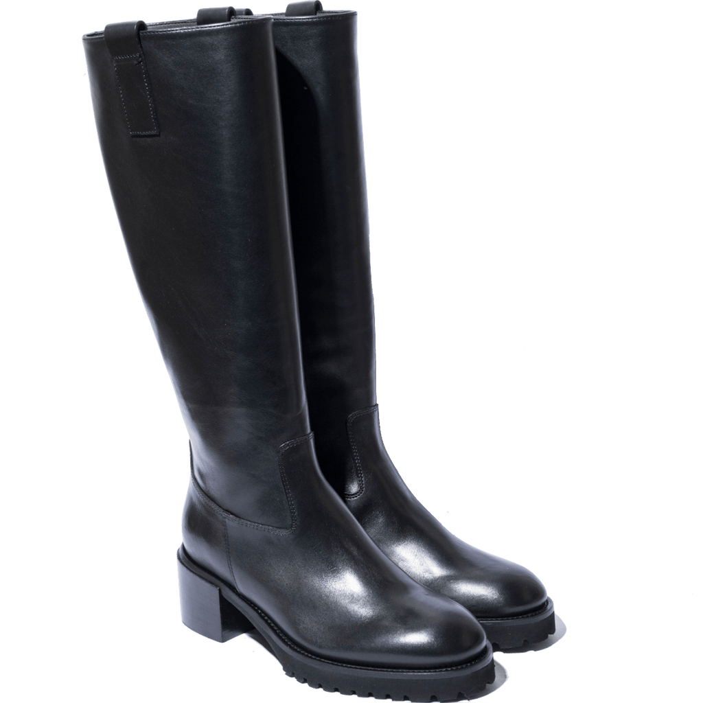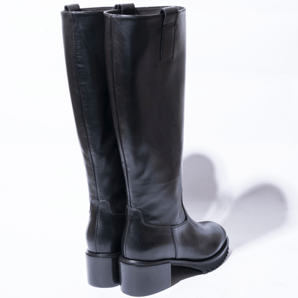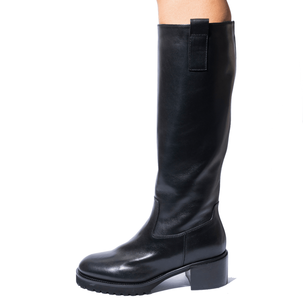Stivali molto comodi, di origine marchigiana, dallo stile cavallerizzo, semplice e lineare. Tomaia in pelle morbida, nera, con asole laterali e tacco quadrato di altezza 5 cm. Interno foderato in pelle; cerniera sul lato interno, che facilita l'ingresso del piede. Fondo in gomma "carro armato", flessibile; plantare in pelle. Realizzati con l'impiego di pellami e materiali pregiati
