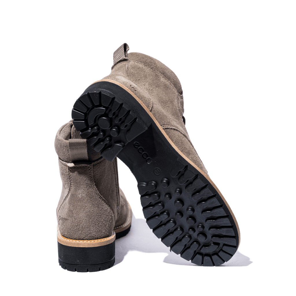 Stivaletto alla caviglia con tomaia in pelle robusta, scamosciata, color tortora, ed interno in tessuto traspirante. Tecnologia Ecco Fluidform, flessibile e anatomica: la scarpa si adatta perfettamente alla forma del piede. Suola in gomma "carro armato", con tacco di 3 cm. Plantare in tessuto, estraibile. Cerniera sul lato interno, che facilita l'ingresso del piede, anche senza l'impiego dei lacci.