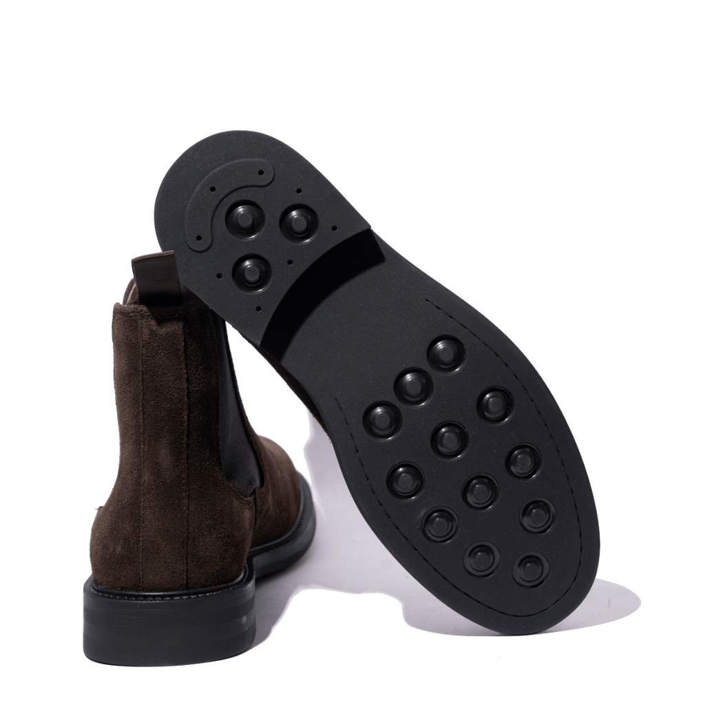 Stivaletti classici Saxone, modello chelsea o beatles, con i due elastici laterali, in pelle robusta scamosciata marrone. Interno foderato in pelle. Fondo in gomma con bolli antiscivolo, cucito su base in cuoio