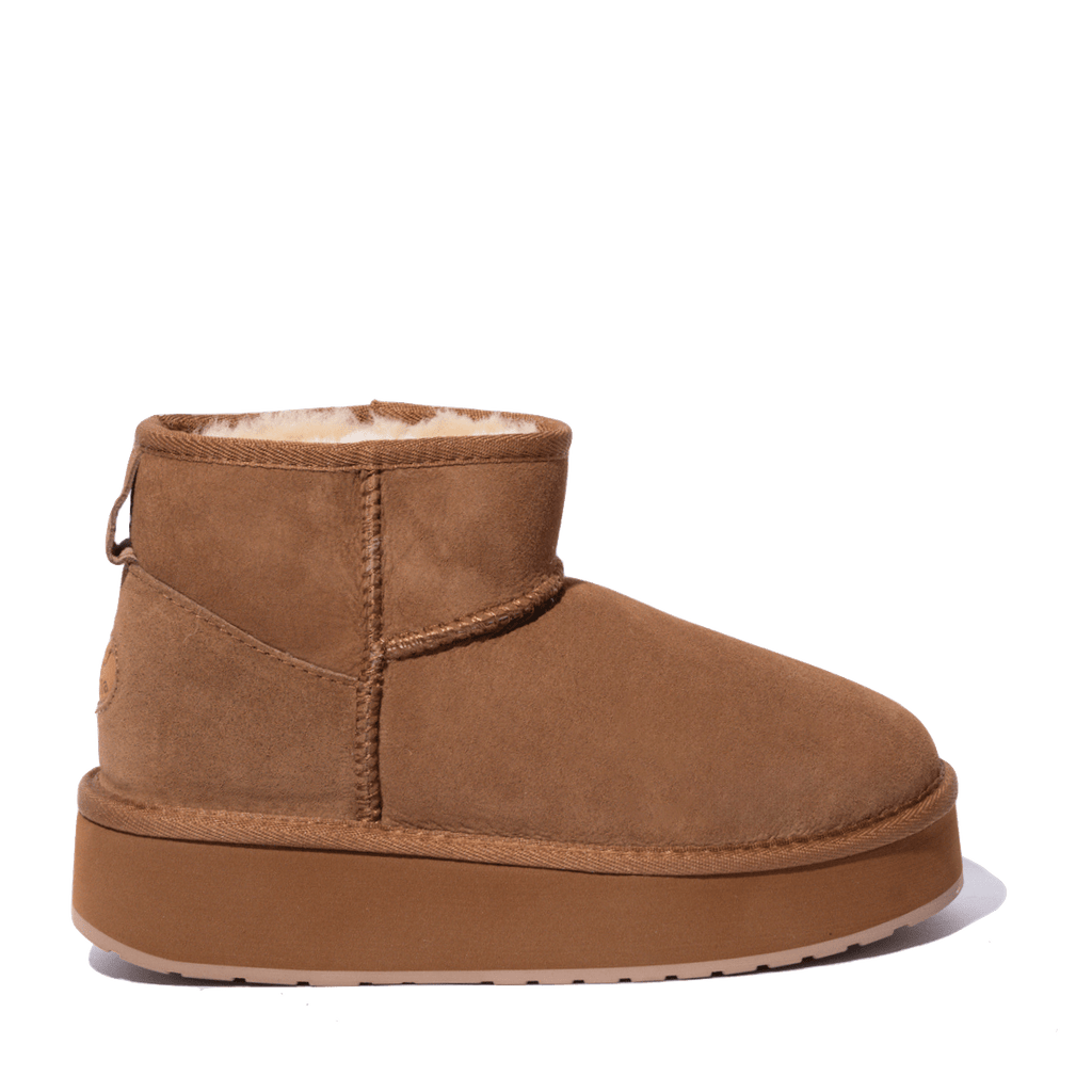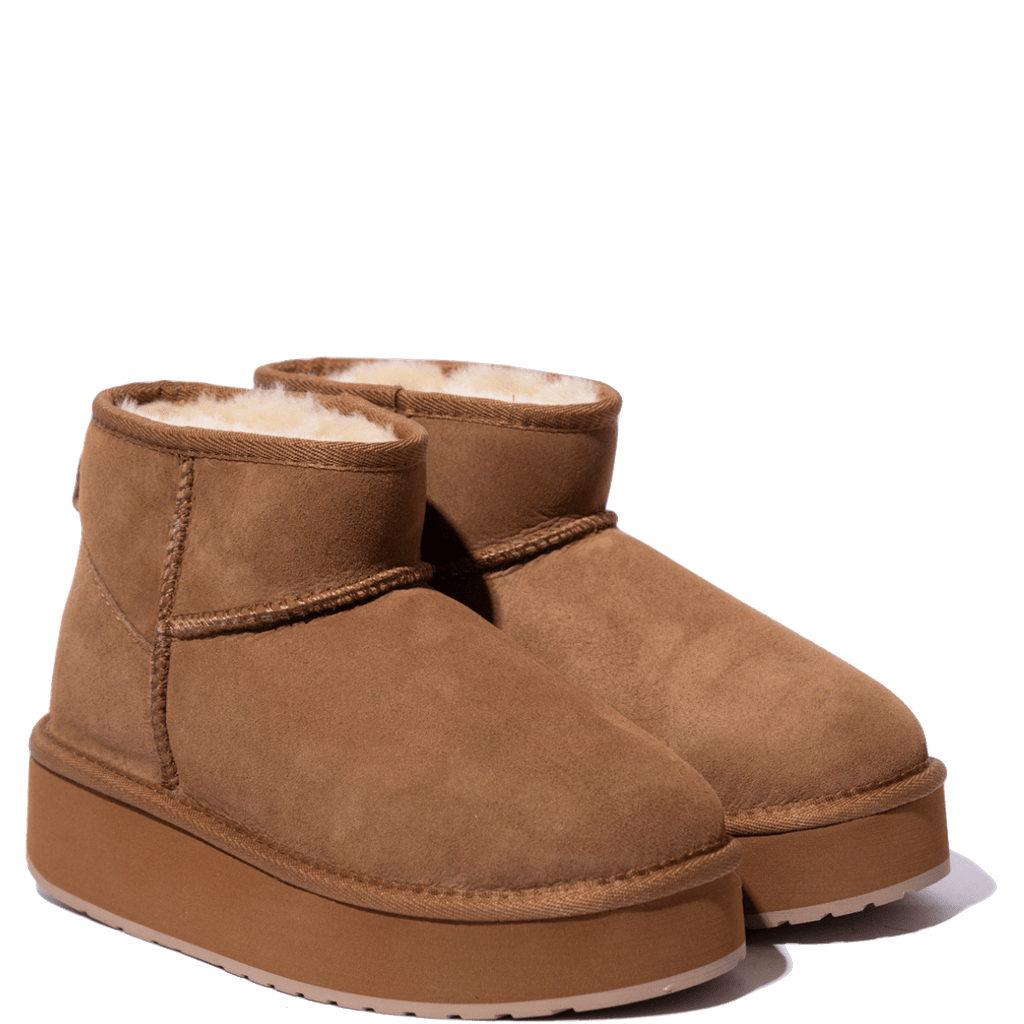Stivaletti slip-on  alla caviglia del marchio australiano noto per i suoi prodotti comodi, realizzati con materiali naturali che garantiscono comfort e durata. Tomaia in montone australiano, resistente all'acqua, imbottito, e suola platform in gomma robusta, di altezza 4.5 cm. Sottopiede con leggera imbottitura memory foam, per una comoda ammortizzazione. Il montone traspira e naturalmente allontana l'umidità, lasciando le calzature senza odore e i piedi con la perfetta temperatura